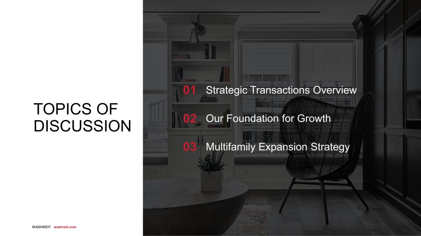 2 WASHREIT washreit.com This presentation does not constitute an offer to sell or the solicitation of an offer to buy any securities of WashREIT, nor shall there be any sale of securities in any jurisdiction in which such offer, solicitation or sale would be unlawful prior to the registration or qualification of such securities under the securities law of any such jurisdiction. If WashREIT were to conduct an offering of securities in the future, it will be made under an effective registration statement filed with the Securities and Exchange Commission and only by means of a prospectus supplement and accompanying prospectus. In such an event, a copy of the prospectus and the applicable preliminary prospectus supplement and final prospectus supplement, as well as the final term sheet, if applicable, relating to such transaction will be able to be obtained from the Securities and Exchange Commission at www.sec.gov, from any underwriters in that offering, or by contacting WashREIT at 202-774-3200. Before you invest in any such offering, you should read the applicable prospectus supplement related to such offering, the accompanying prospectus and the information incorporated by reference therein and other documents WashREIT has then filed with the Securities and Exchange Commission for more complete information about WashREIT and any such offering. Forward-Looking Statements Certain statements in this presentation are "forward-looking statements" within the meaning of the Private Securities Litigation Reform Act of 1995 and involve risks and uncertainties. Forward-looking statements relate to expectations, beliefs, projections, future plans and strategies, anticipated events or trends and similar expressions concerning matters that are not historical facts. In some cases, you can identify forward looking statements by the use of forward-looking terminology such as “may,” “will,” “should,” “expects,” "assumed," "pro forma," "target," “intends,” “plans,” “anticipates,” “believes,” “estimates,” “predicts,” or “potential” or the negative of these words and phrases or similar words or phrases which are predictions of or indicate future events or trends and which do not relate solely to historical matters. Such statements involve known and unknown risks, uncertainties, and other factors which may cause the actual results, performance, or achievements of WashREIT to be materially different from future results, performance or achievements expressed or implied by such forward looking statements. Currently, one of the most significant factors continues to be adverse effect of the COVID-19 virus, including any variants and mutations thereof, the actions taken to contain the pandemic or mitigate the impact of COVID-19, and the direct and indirect economic effects of the pandemic and containment measures. The extent to which COVID-19 continues to impact WashREIT and its tenants will depend on future developments, which are highly uncertain and cannot be predicted with confidence, including the scope, severity and duration of the pandemic, the actions taken to contain the pandemic or mitigate its impact, and the direct and indirect economic effects of the pandemic and containment measures, the continued speed and success of the vaccine rollout, effectiveness and willingness of people to take COVID-19 vaccines, and the duration of associated immunity and their efficacy against emerging variants of COVID-19, among others. Moreover, investors are cautioned to interpret many of the risks identified in the risk factors discussed in our Annual Report on Form 10-K for the year ended December 31, 2020 filed on February 16, 2021, as being heightened as a result of the ongoing and numerous adverse impacts of COVID-19. Additional factors which may cause the actual results, performance, or achievements of WashREIT to be materially different from future results, performance or achievements expressed or implied by such forward-looking statements include, but are not limited to the risks associated with the failure to enter into and/or complete contemplated acquisitions or dispositions (including the announced office portfolio sale transaction and assumed retail asset sales) within the price ranges anticipated and on the terms and timing anticipated, or at all; our ability to execute on our strategies, including new strategies with respect to our operations and our portfolio, including the acquisition of multifamily properties and the repayment of debt, and to realize any anticipated benefits, including the performance of any acquired multifamily properties at the levels anticipated; whether our Actual NOI for 2021 will be consistent with our Estimated 2021 NOI; whether our actual Net Leverage (including its components of Net Debt and Adjusted EBITDA) will be consistent with our targeted Net Leverage range (including its components of Net Debt and Adjusted EBITDA); whether Actual 2021 and 2022 NOI for Trove will be consistent with Annualized Estimated 2021 NOI and our Estimated Stabilized NOI for Trove for Q2 2022; whether actual 2021 NOI for Watergate 600 will be consistent with Estimated 2021 NOI for Watergate 600; our assumptions regarding capitalization rates; the ownership of real estate in general and our real estate assets in particular; the economic health of the greater Washington, DC metro region and the larger Southeastern region; changes in the composition and geographic location of our portfolio; fluctuations in interest rates; reductions in or actual or threatened changes to the timing of federal government spending; the risks related to use of third-party providers and joint venture partners; the ability to control our operating expenses; the economic health of our tenants; shifts away from brick and mortar stores to ecommerce; the availability and terms of financing and capital and the general volatility of securities markets; compliance with applicable laws, in