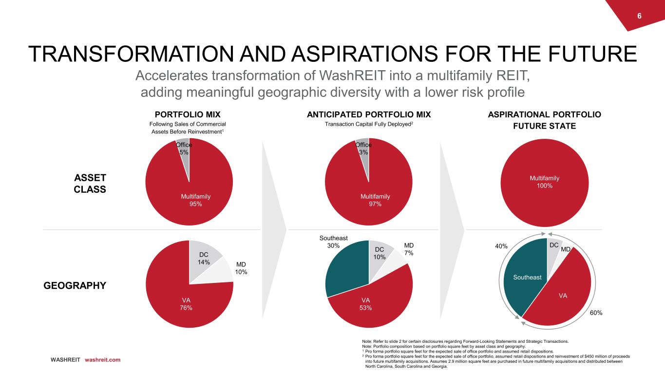5 WASHREIT washreit.com Multifamily 51%Office 41% Retail 8% Q1’20211Q1’2013 Note: Refer to slide 2 for certain disclosure regarding Forward-Looking Statements and Strategic Transactions. Note: Portfolio composition based on Cash NOI contribution by asset class and geography. 1 Includes actual NOI of $42.9 million for Q1 2021 plus $1.6 million of Q2 2022 estimated stabilized NOI from Trove. WASHREIT HAS ALLOCATED CAPITAL TO ITS STRONGEST ASSET CLASS Asset recycling has increased exposure to asset class and geography that research has indicated has the strongest fundamentals ASSET CLASS GEOGRAPHY Medical Office 14% Multifamily 16% Office 50% Retail 20% DC 25% MD 29% VA 46% DC 27% MD 8% VA 65%