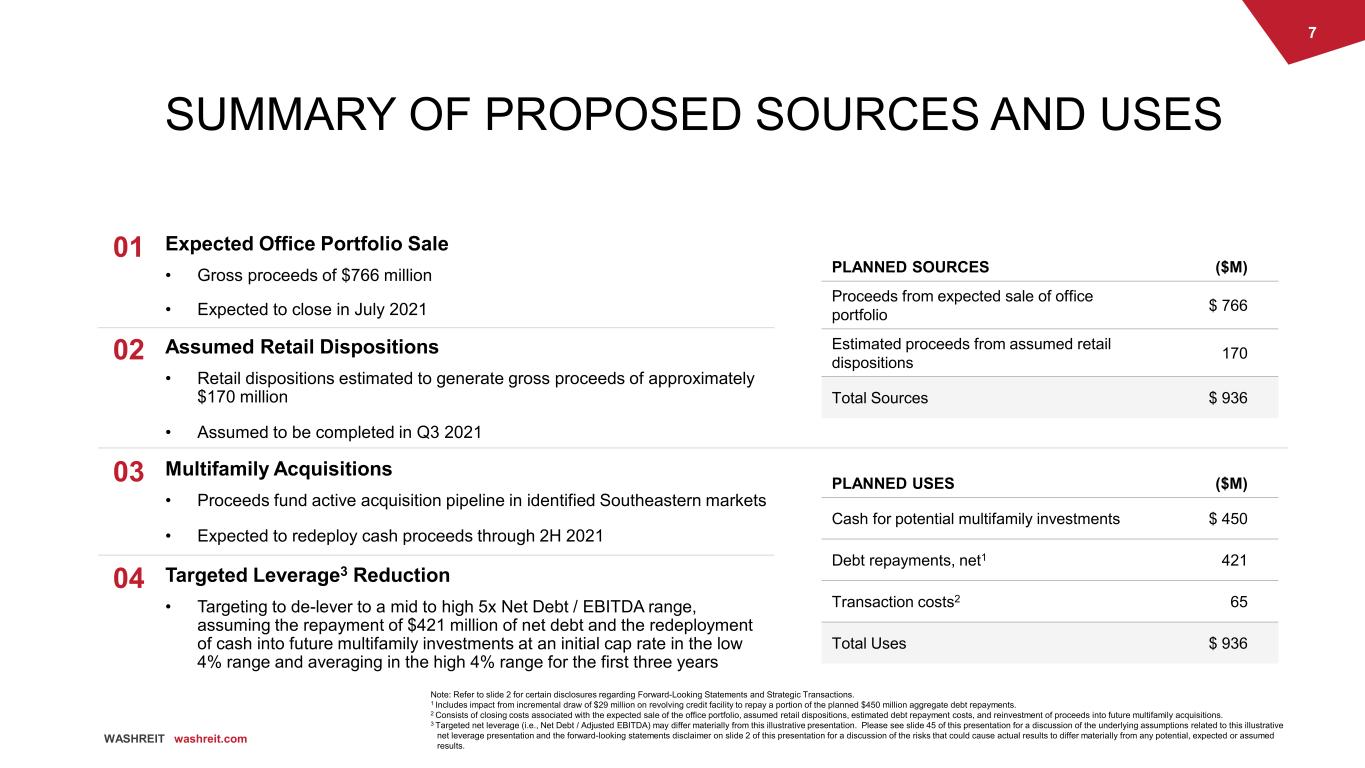 6 WASHREIT washreit.com Office 5% Multifamily 95% DC 14% MD 10% VA 76% PORTFOLIO MIX Following Sales of Commercial Assets Before Reinvestment1 Note: Refer to slide 2 for certain disclosures regarding Forward-Looking Statements and Strategic Transactions. Note: Portfolio composition based on portfolio square feet by asset class and geography. 1 Pro forma portfolio square feet for the expected sale of office portfolio and assumed retail dispositions. 2 Pro forma portfolio square feet for the expected sale of office portfolio, assumed retail dispositions and reinvestment of $450 million of proceeds into future multifamily acquisitions. Assumes 2.9 million square feet are purchased in future multifamily acquisitions and distributed between North Carolina, South Carolina and Georgia. TRANSFORMATION AND ASPIRATIONS FOR THE FUTURE Accelerates transformation of WashREIT into a multifamily REIT, adding meaningful geographic diversity with a lower risk profile ASPIRATIONAL PORTFOLIO FUTURE STATE Multifamily 100% ASSET CLASS GEOGRAPHY DC MD VA Southeast 40% 60% Office 3% Multifamily 97% DC 10% MD 7% VA 53% Southeast 30% ANTICIPATED PORTFOLIO MIX Transaction Capital Fully Deployed2