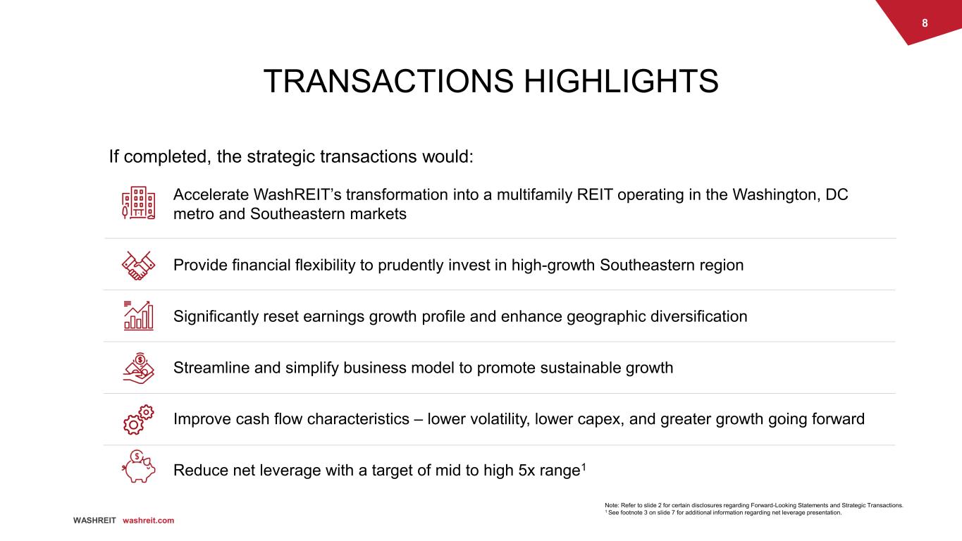 7 WASHREIT washreit.com Expected Office Portfolio Sale • Gross proceeds of $766 million • Expected to close in July 2021 Multifamily Acquisitions • Proceeds fund active acquisition pipeline in identified Southeastern markets • Expected to redeploy cash proceeds through 2H 2021 Targeted Leverage3 Reduction • Targeting to de-lever to a mid to high 5x Net Debt / EBITDA range, assuming the repayment of $421 million of net debt and the redeployment of cash into future multifamily investments at an initial cap rate in the low 4% range and averaging in the high 4% range for the first three years Note: Refer to slide 2 for certain disclosures regarding Forward-Looking Statements and Strategic Transactions. 1 Includes impact from incremental draw of $29 million on revolving credit facility to repay a portion of the planned $450 million aggregate debt repayments. 2 Consists of closing costs associated with the expected sale of the office portfolio, assumed retail dispositions, estimated debt repayment costs, and reinvestment of proceeds into future multifamily acquisitions. 3 Targeted net leverage (i.e., Net Debt / Adjusted EBITDA) may differ materially from this illustrative presentation. Please see slide 45 of this presentation for a discussion of the underlying assumptions related to this illustrative net leverage presentation and the forward-looking statements disclaimer on slide 2 of this presentation for a discussion of the risks that could cause actual results to differ materially from any potential, expected or assumed results. SUMMARY OF PROPOSED SOURCES AND USES 01 03 04 PLANNED SOURCES ($M) Proceeds from expected sale of office portfolio $ 766 Estimated proceeds from assumed retail dispositions 170 Total Sources $ 936 PLANNED USES ($M) Cash for potential multifamily investments $ 450 Debt repayments, net1 421 Transaction costs2 65 Total Uses $ 936 Assumed Retail Dispositions • Retail dispositions estimated to generate gross proceeds of approximately $170 million • Assumed to be completed in Q3 2021 02