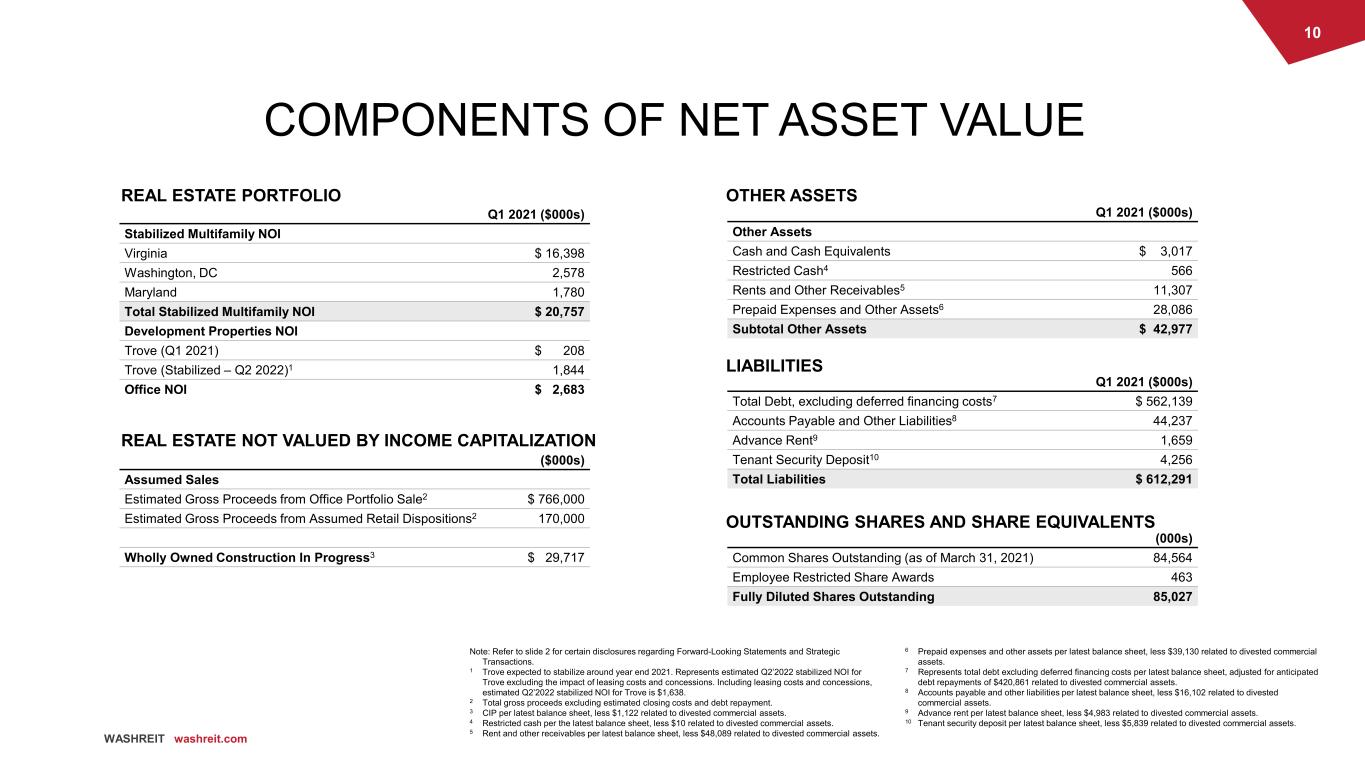 9 WASHREIT washreit.com Equity Market Capitalization $1,869M 77% Unsecured Debt $562M 23% $ 300 $ 283 $ 400 2021 2022 2023 2024 2025 2026 Thereafter IMPROVED AND FORTIFIED CAPITAL STRUCTURE Assumed $421 million net reduction in total debt and targeting net leverage in mid to high 5x range1 DEBT MATURITIES ($M) CAPITALIZATION ($M) Unsecured Debt Credit Facility 59% of Current Debt Matures through 2023 29% of Debt Matures through 2023 Unsecured Debt Credit Facility $3 million cash & cash equivalents as of Q1’2021 Q1 2021 ACTUAL Q1 2021 POST POTENTIAL DISPOSITIONS2 TO BE REPAID Term Loan $150 million TO BE DRAWN Credit Facility $29 million TO BE REPAID $300 million, 3.95% Bonds Due 2022 Assumes $421 million net reduction in total debt plus additional cash of $450 million for future multifamily acquisitions Note: Refer to slide 2 for certain disclosures regarding Forward-Looking Statements and Strategic Transactions. 1 See footnote 3 on slide 7 for additional information regarding net leverage presentation. 2 Assumed repayment of debt following completion of expected office sale and assumed retail dispositions. 3 As of March 31, 2021. Equity Market Capitalization $1,869M 66% Unsecured Debt $983M 34% 3 3 $ 162 $ 400 2021 2022 2023 2024 2025 2026 Thereafter
