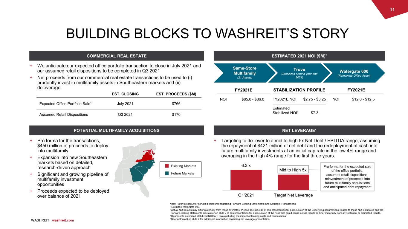 10 WASHREIT washreit.com COMPONENTS OF NET ASSET VALUE Note: Refer to slide 2 for certain disclosures regarding Forward-Looking Statements and Strategic Transactions. 1 Trove expected to stabilize around year end 2021. Represents estimated Q2’2022 stabilized NOI for Trove excluding the impact of leasing costs and concessions. Including leasing costs and concessions, estimated Q2’2022 stabilized NOI for Trove is $1,638. 2 Total gross proceeds excluding estimated closing costs and debt repayment. 3 CIP per latest balance sheet, less $1,122 related to divested commercial assets. 4 Restricted cash per the latest balance sheet, less $10 related to divested commercial assets. 5 Rent and other receivables per latest balance sheet, less $48,089 related to divested commercial assets. 6 Prepaid expenses and other assets per latest balance sheet, less $39,130 related to divested commercial assets. commercial assets. 7 Represents total debt excluding deferred financing costs per latest balance sheet, adjusted for anticipated debt repayments of $420,861 related to divested commercial assets. 8 Accounts payable and other liabilities per latest balance sheet, less $16,102 related to divested commercial assets. 9 Advance rent per latest balance sheet, less $4,983 related to divested commercial assets. 10 Tenant security deposit per latest balance sheet, less $5,839 related to divested commercial assets. Q1 2021 ($000s) Stabilized Multifamily NOI Virginia $ 16,398 Washington, DC 2,578 Maryland 1,780 Total Stabilized Multifamily NOI $ 20,757 Development Properties NOI Trove (Q1 2021) $ 208 Trove (Stabilized – Q2 2022)1 1,844 Office NOI $ 2,683 ($000s) Assumed Sales Estimated Gross Proceeds from Office Portfolio Sale2 $ 766,000 Estimated Gross Proceeds from Assumed Retail Dispositions2 170,000 Wholly Owned Construction In Progress3 $ 29,717 REAL ESTATE PORTFOLIO REAL ESTATE NOT VALUED BY INCOME CAPITALIZATION OTHER ASSETS LIABILITIES OUTSTANDING SHARES AND SHARE EQUIVALENTS Q1 2021 ($000s) Other Assets Cash and Cash Equivalents $ 3,017 Restricted Cash4 566 Rents and Other Receivables5 11,307 Prepaid Expenses and Other Assets6 28,086 Subtotal Other Assets $ 42,977 Q1 2021 ($000s) Total Debt, excluding deferred financing costs7 $ 562,139 Accounts Payable and Other Liabilities8 44,237 Advance Rent9 1,659 Tenant Security Deposit10 4,256 Total Liabilities $ 612,291 (000s) Common Shares Outstanding (as of March 31, 2021) 84,564 Employee Restricted Share Awards 463 Fully Diluted Shares Outstanding 85,027
