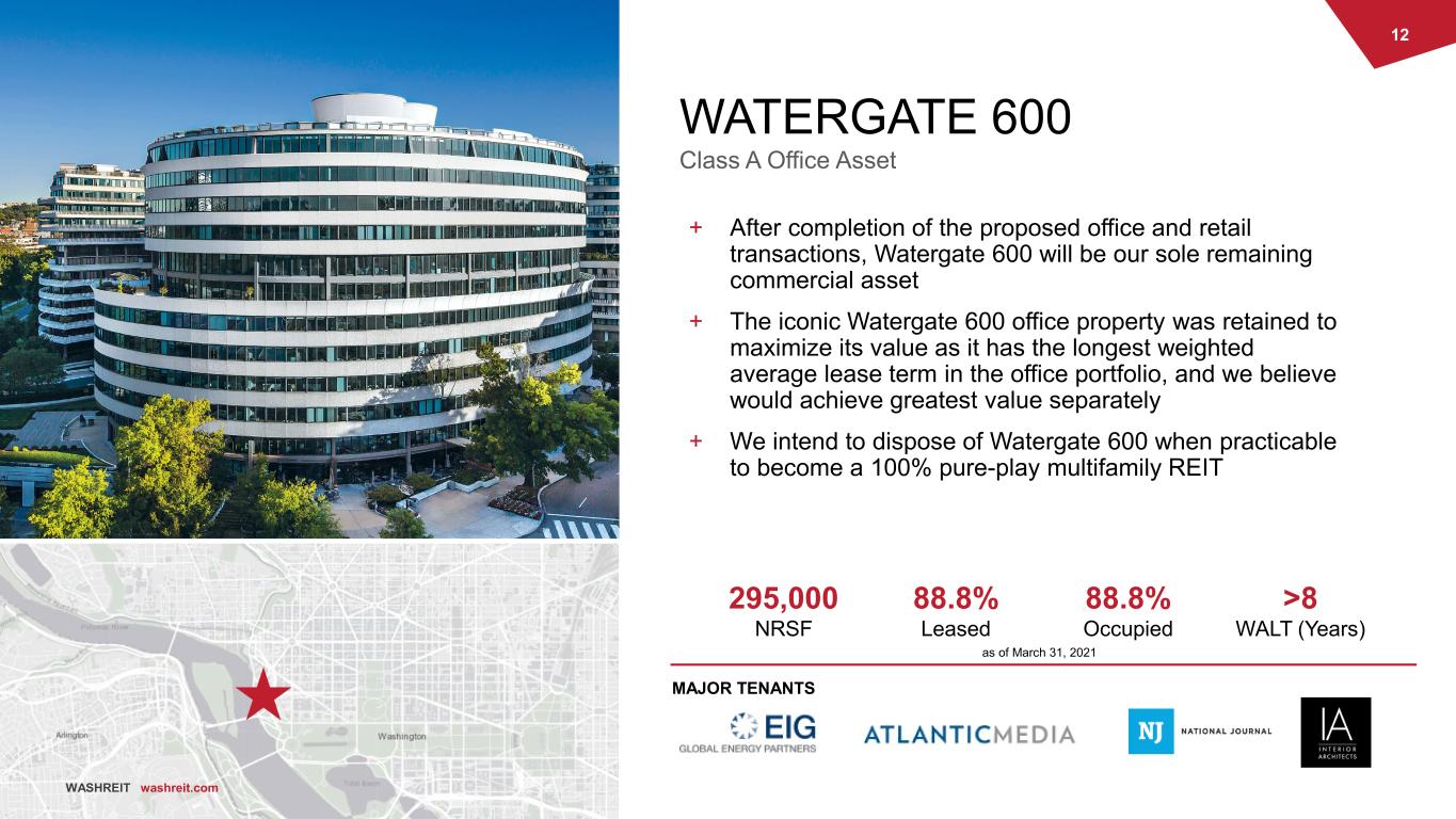 11 WASHREIT washreit.com BUILDING BLOCKS TO WASHREIT’S STORY COMMERCIAL REAL ESTATE ESTIMATED 2021 NOI ($M)2 POTENTIAL MULTIFAMILY ACQUISITIONS NET LEVERAGE4 EST. CLOSING EST. PROCEEDS ($M) Expected Office Portfolio Sale1 July 2021 $766 Assumed Retail Dispositions Q3 2021 $170 + We anticipate our expected office portfolio transaction to close in July 2021 and our assumed retail dispositions to be completed in Q3 2021 + Net proceeds from our commercial real estate transactions to be used to (i) prudently invest in multifamily assets in Southeastern markets and (ii) deleverage Same-Store Multifamily (21 Assets) Trove (Stabilizes around year end 2021) Watergate 600 (Remaining Office Asset) + Pro forma for the transactions, $450 million of proceeds to deploy into multifamily + Expansion into new Southeastern markets based on detailed, research-driven approach + Significant and growing pipeline of multifamily investment opportunities + Proceeds expected to be deployed over balance of 2021 + Targeting to de-lever to a mid to high 5x Net Debt / EBITDA range, assuming the repayment of $421 million of net debt and the redeployment of cash into future multifamily investments at an initial cap rate in the low 4% range and averaging in the high 4% range for the first three years. Existing Markets Future Markets Note: Refer to slide 2 for certain disclosures regarding Forward-Looking Statements and Strategic Transactions. 1 Excludes Watergate 600. 2 Actual NOI results may differ materially from these estimates. Please see slide 45 of this presentation for a discussion of the underlying assumptions related to these NOI estimates and the forward-looking statements disclaimer on slide 2 of this presentation for a discussion of the risks that could cause actual results to differ materially from any potential or estimated results. 3 Represents estimated stabilized NOI for Trove excluding the impact of leasing costs and concessions. 4 See footnote 3 on slide 7 for additional information regarding net leverage presentation. FY2021E NOI $85.0 - $86.0 STABILIZATION PROFILE FY2021E NOI $2.75 - $3.25 Estimated Stabilized NOI3 $7.3 FY2021E NOI $12.0 - $12.5 Pro forma for the expected sale of the office portfolio, assumed retail dispositions, reinvestment of proceeds into future multifamily acquisitions and anticipated debt repayment 6.3 x Mid to High 5x Q1'2021 Target Net Leverage