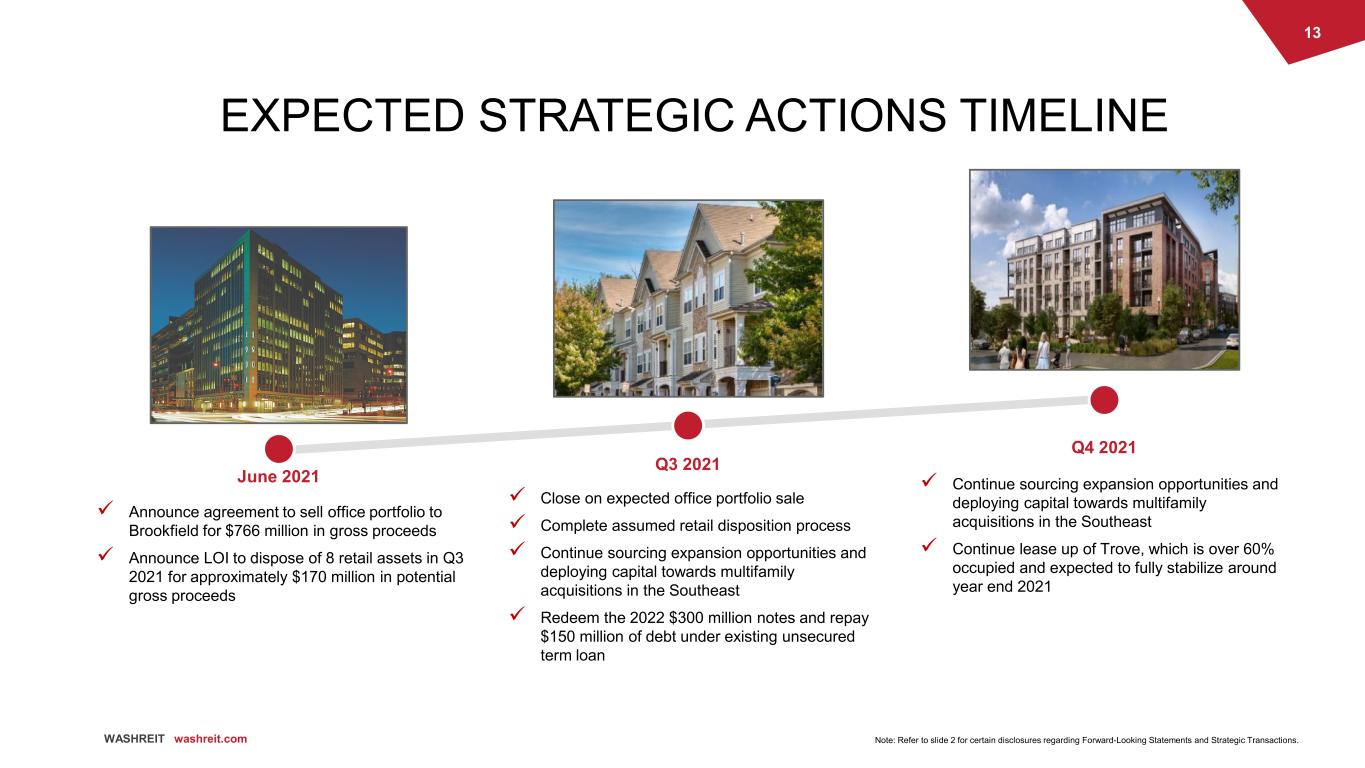 12 WASHREIT washreit.com ACCENT IMAGE Place and image in this space. Resize and use the crop tool to fit on top of this box. WATERGATE 600 Class A Office Asset + After completion of the proposed office and retail transactions, Watergate 600 will be our sole remaining commercial asset + The iconic Watergate 600 office property was retained to maximize its value as it has the longest weighted average lease term in the office portfolio, and we believe would achieve greatest value separately + We intend to dispose of Watergate 600 when practicable to become a 100% pure-play multifamily REIT 295,000 NRSF 88.8% Occupied >8 WALT (Years) 88.8% Leased as of March 31, 2021 MAJOR TENANTS WASHREIT washreit.com
