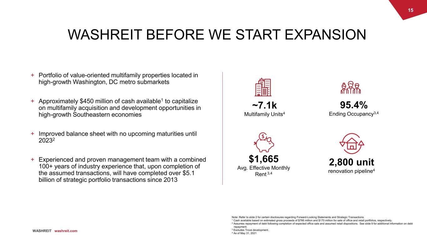 13 WASHREIT washreit.com EXPECTED STRATEGIC ACTIONS TIMELINE June 2021 Announce agreement to sell office portfolio to Brookfield for $766 million in gross proceeds Announce LOI to dispose of 8 retail assets in Q3 2021 for approximately $170 million in potential gross proceeds Close on expected office portfolio sale Complete assumed retail disposition process Continue sourcing expansion opportunities and deploying capital towards multifamily acquisitions in the Southeast Redeem the 2022 $300 million notes and repay $150 million of debt under existing unsecured term loan Q3 2021 Continue sourcing expansion opportunities and deploying capital towards multifamily acquisitions in the Southeast Continue lease up of Trove, which is over 60% occupied and expected to fully stabilize around year end 2021 Q4 2021 Note: Refer to slide 2 for certain disclosures regarding Forward-Looking Statements and Strategic Transactions.