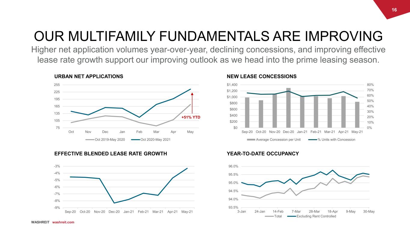 15 WASHREIT washreit.com ~7.1k Multifamily Units4 + Portfolio of value-oriented multifamily properties located in high-growth Washington, DC metro submarkets + Approximately $450 million of cash available1 to capitalize on multifamily acquisition and development opportunities in high-growth Southeastern economies + Improved balance sheet with no upcoming maturities until 20232 + Experienced and proven management team with a combined 100+ years of industry experience that, upon completion of the assumed transactions, will have completed over $5.1 billion of strategic portfolio transactions since 2013 95.4% Ending Occupancy3,4 $1,665 Avg. Effective Monthly Rent 3,4 2,800 unit renovation pipeline4 WASHREIT BEFORE WE START EXPANSION Note: Refer to slide 2 for certain disclosures regarding Forward-Looking Statements and Strategic Transactions. 1 Cash available based on estimated gross proceeds of $766 million and $170 million for sale of office and retail portfolios, respectively. 2 Assumes repayment of debt following completion of expected office sale and assumed retail dispositions. See slide 9 for additional information on debt repayment. 3 Excludes Trove development. 4 As of May 31, 2021