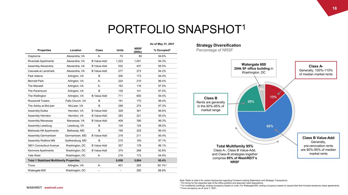 17 WASHREIT washreit.com 93.0% 93.5% 94.0% 94.5% 95.0% 95.5% 96.0% 96.5% + Our renovation platform is in motion in select submarkets, and we expect to continue to scale our programs as market conditions improve + Assembly Manassas is an example of one of our markets that has performed well this year + We are encouraged by the strong occupancy level of over 96%, renewal lease rate growth of over 5% in March, and stable rent gap to local Class A rents RENOVATION PROGRAM MARKET PERFORMANCE TRACKING: MANASSAS CASE STUDY Suburban Urban -12% -8% -4% 0% 4% Sep-20 Nov-20 Jan-21 Mar-21 May-21 Urban Suburban $1,300 $1,400 $1,500 $1,600 $1,700 $1,800 Jan-20 Apr-20 Jul-20 Oct-20 Jan-21 Apr-21 Assembly Manassas Class A Rent in Manassas OUR SUBURBAN PERFORMANCE REMAINS STRONG Suburban performance remains strong and lease rates are improving more quickly in the suburbs than in urban markets, which are on the cusp of turning positive AVERAGE MONTHLY RENT DIFFERENTIAL OCCUPANCY1 EFFECTIVE BLENDED LEASE RATE GROWTH New lease rates improved by ~3.0% in May from April on an effective basis ~70% of our ~2,800-unit renovation pipeline is in our suburban assets 1 Occupancy as of May 31, 2021