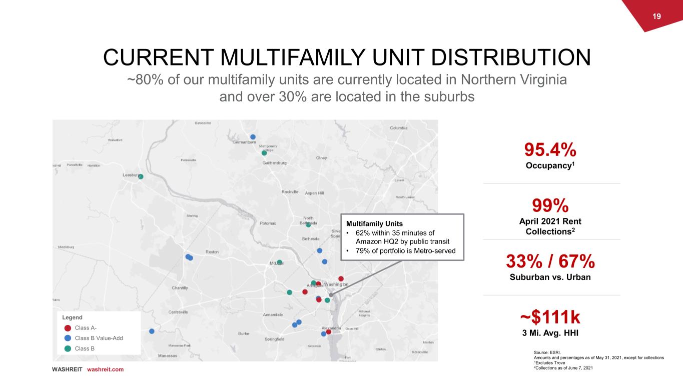 18 WASHREIT washreit.com PORTFOLIO SNAPSHOT1 Note: Refer to slide 2 for certain disclosures regarding Forward-Looking Statements and Strategic Transactions. 1 Pro forma for the expected sale of the office portfolio and assumed retail dispositions. 2 For multifamily buildings, ending occupancy based on units. For Watergate 600, ending occupancy based on square feet that includes temporary lease agreements. 3 Trove occupancy as of June 7, 2021. As of May 31, 2021 Properties Location Class Units NRSF (000s) % Occupied 2 Clayborne Alexandria, VA A- 74 60 94.6% Riverside Apartments Alexandria, VA B Value-Add 1,222 1,001 94.3% Assembly Alexandria Alexandria, VA B Value-Add 532 437 95.5% Cascade at Landmark Alexandria, VA B Value-Add 277 273 94.2% Park Adams Arlington, VA B 200 173 94.0% Bennett Park Arlington, VA A- 224 215 96.4% The Maxwell Arlington, VA A- 163 116 97.5% The Paramount Arlington, VA B 135 141 97.0% The Wellington Arlington, VA B Value-Add 711 600 94.4% Roosevelt Towers Falls Church, VA B 191 170 98.4% The Ashby at McLean McLean, VA B 256 274 97.3% Assembly Dulles Herndon, VA B Value-Add 328 361 96.6% Assembly Herndon Herndon, VA B Value-Add 283 221 95.4% Assembly Manassas Manassas, VA B Value-Add 408 390 96.3% Assembly Leesburg Leesburg, VA B 134 124 98.5% Bethesda Hill Apartments Bethesda, MD B 195 225 96.4% Assembly Germantown Germantown, MD B Value-Add 218 211 95.4% Assembly Watkins Mill Gaithersburg, MD B 210 193 97.1% 3801 Connecticut Avenue Washington, DC B Value-Add 307 178 96.1% Kenmore Apartments Washington, DC B Value-Add 374 268 92.8% Yale West Washington, DC A- 216 173 94.9% Total // Stabilized Multifamily Properties 6,658 5,804 95.4% Trove Arlington, VA A- 401 293 60.1%3 Watergate 600 Washington, DC – – 295 88.8% Class A- Generally, 100%-110% of median market rents Total Multifamily 95% Class A-, Class B Value-Add, and Class B strategies together comprise 95% of WashREIT’s NRSF Class B Rents are generally in the 80%-95% of market range Watergate 600 294k SF office building in Washington, DC Strategy Diversification Percentage of NRSF 20% 5% 13% Class B Value-Add Generally, pre-renovation rents are 80%-95% of median market rents 62%
