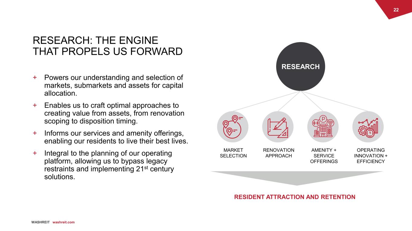 21 WASHREIT washreit.com + Significant Demand Drivers Population growth, in-migration, extended renting tenure and unaffordability of for-sale housing for targeted renter segments + Stronger Rent Growth Driven by solid demand, rising home prices, and minimal new product at mid-range rents + Lower Recurring Capital Expenditures FAD capex in 2020 as a percentage of portfolio NOI: 6% for multifamily vs. approximately 20% office1 + More Consistent Returns Less downtime, more stable cash flows, more diversified resident base + Improves Our Business Profile Multifamily is a less risky asset class with more stable cash flows and few capital expenditures, together with geographic expansion into new markets significantly improves our business profile + Improves Our Credit Profile Estimated $421 million of debt repayments and deployment of remaining disposition proceeds into future multifamily acquisitions should enable us to reduce our leverage to mid to high 5x range, with new leverage governors in place to target 5.0x to 6.0x on a sustained basis 1FY 2020 actual capital expenditures and NOI. WHY MULTIFAMILY? Trove Arlington, Virginia