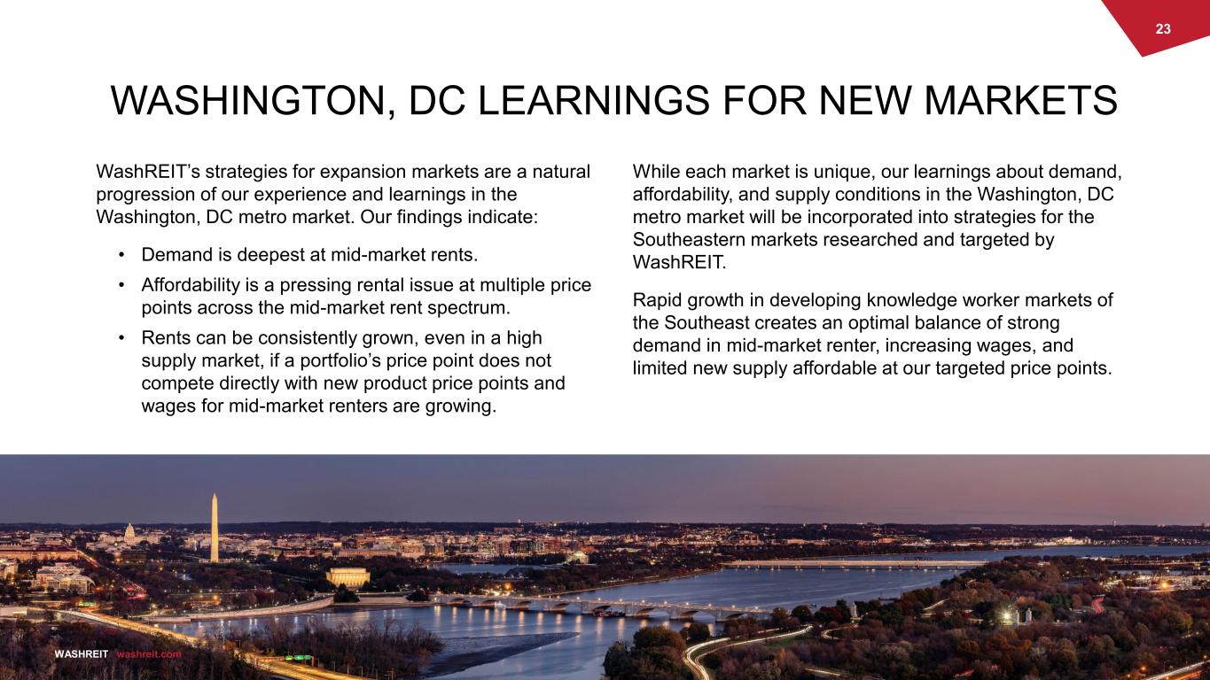 22 WASHREIT washreit.com RESEARCH: THE ENGINE THAT PROPELS US FORWARD + Powers our understanding and selection of markets, submarkets and assets for capital allocation. + Enables us to craft optimal approaches to creating value from assets, from renovation scoping to disposition timing. + Informs our services and amenity offerings, enabling our residents to live their best lives. + Integral to the planning of our operating platform, allowing us to bypass legacy restraints and implementing 21st century solutions. RESEARCH MARKET SELECTION RENOVATION APPROACH AMENITY + SERVICE OFFERINGS OPERATING INNOVATION + EFFICIENCY RESIDENT ATTRACTION AND RETENTION