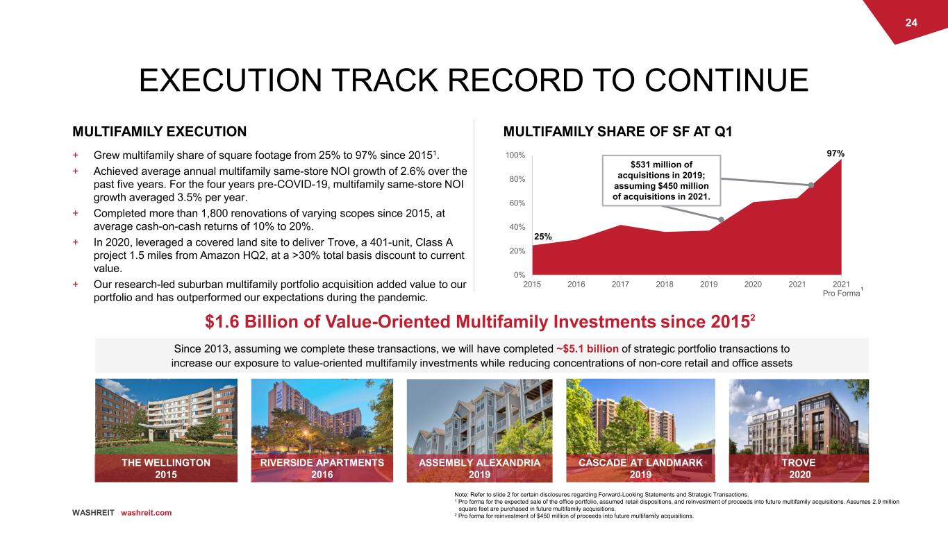 24 WASHREIT washreit.com 0% 20% 40% 60% 80% 100% 2015 2016 2017 2018 2019 2020 2021 2021 Pro Forma TROVE 2020 RIVERSIDE APARTMENTS 2016 ASSEMBLY ALEXANDRIA 2019 CASCADE AT LANDMARK 2019 $1.6 Billion of Value-Oriented Multifamily Investments since 20152 Since 2013, assuming we complete these transactions, we will have completed ~$5.1 billion of strategic portfolio transactions to increase our exposure to value-oriented multifamily investments while reducing concentrations of non-core retail and office assets MULTIFAMILY EXECUTION + Grew multifamily share of square footage from 25% to 97% since 20151. + Achieved average annual multifamily same-store NOI growth of 2.6% over the past five years. For the four years pre-COVID-19, multifamily same-store NOI growth averaged 3.5% per year. + Completed more than 1,800 renovations of varying scopes since 2015, at average cash-on-cash returns of 10% to 20%. + In 2020, leveraged a covered land site to deliver Trove, a 401-unit, Class A project 1.5 miles from Amazon HQ2, at a >30% total basis discount to current value. + Our research-led suburban multifamily portfolio acquisition added value to our portfolio and has outperformed our expectations during the pandemic. EXECUTION TRACK RECORD TO CONTINUE THE WELLINGTON 2015 MULTIFAMILY SHARE OF SF AT Q1 Note: Refer to slide 2 for certain disclosures regarding Forward-Looking Statements and Strategic Transactions. 1 Pro forma for the expected sale of the office portfolio, assumed retail dispositions, and reinvestment of proceeds into future multifamily acquisitions. Assumes 2.9 million square feet are purchased in future multifamily acquisitions. 2 Pro forma for reinvestment of $450 million of proceeds into future multifamily acquisitions. 1 25% 97% $531 million of acquisitions in 2019; assuming $450 million of acquisitions in 2021.