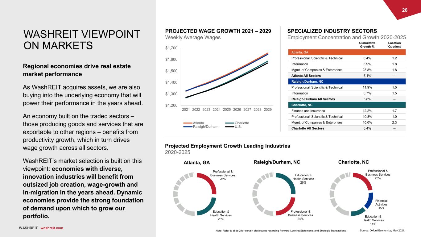 25 WASHREIT washreit.com ACCENT IMAGE Place and image in this space. Resize and use the crop tool to fit on top of this box. EXPANSION MARKETS WashREIT expects to build upon its experience and success in the Washington, DC metro market to expand to Southeastern markets with strong growth prospects. Our research indicates that our strategies can be successful in these markets, diversifying our economic concentration risk, while providing opportunities for additional growth - driven by current and projected long- term rent growth outperformance. Targeted Expansion Markets: • Atlanta, GA • Raleigh/Durham, NC • Charlotte, NC-SC Growth of the portfolio over the mid-term will rebalance asset allocation toward WashREIT’s Southeastern markets, while retaining a significant presence in the Washington, DC metro region. Washington, DC Metro Southeastern Metros Aspirational Future Market Allocation (units) Note: Refer to slide 2 for certain disclosures regarding Forward Looking Statements and Strategic Transactions.
