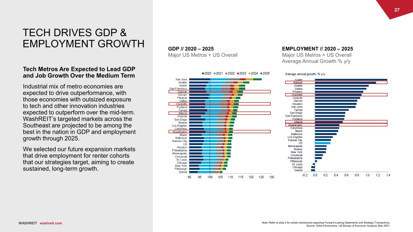 26 WASHREIT washreit.com WASHREIT VIEWPOINT ON MARKETS Regional economies drive real estate market performance As WashREIT acquires assets, we are also buying into the underlying economy that will power their performance in the years ahead. An economy built on the traded sectors – those producing goods and services that are exportable to other regions – benefits from productivity growth, which in turn drives wage growth across all sectors. WashREIT’s market selection is built on this viewpoint: economies with diverse, innovation industries will benefit from outsized job creation, wage-growth and in-migration in the years ahead. Dynamic economies provide the strong foundation of demand upon which to grow our portfolio. Charlotte, NC Raleigh/Durham, NC Atlanta, GA Professional & Business Services 23% Financial Activities 15% Education & Health Services 14% Education & Health Services 23% Professional & Business Services 26% Professional & Business Services 24% Education & Health Services 26% $1,200 $1,300 $1,400 $1,500 $1,600 $1,700 2021 2022 2023 2024 2025 2026 2027 2028 2029 Atlanta Charlotte Raleigh/Durham U.S. Projected Employment Growth Leading Industries 2020-2025 PROJECTED WAGE GROWTH 2021 – 2029 Weekly Average Wages SPECIALIZED INDUSTRY SECTORS Employment Concentration and Growth 2020-2025 Cumulative Growth % Location Quotient Atlanta, GA Professional, Scientific & Technical 8.4% 1.2 Information 8.9% 1.8 Mgmt. of Companies & Enterprises 23.8% 1.8 Atlanta All Sectors 7.1% -- Raleigh/Durham, NC Professional, Scientific & Technical 11.9% 1.5 Information 6.7% 1.5 Raleigh/Durham All Sectors 5.8% -- Charlotte, NC Finance and Insurance 12.2% 1.7 Professional, Scientific & Technical 10.8% 1.0 Mgmt. of Companies & Enterprises 10.0% 2.3 Charlotte All Sectors 6.4% -- Source: Oxford Economics; May 2021. WASHREIT washreit.com Note: Refer to slide 2 for certain disclosures regarding Forward-Looking Statements and Strategic Transactions.