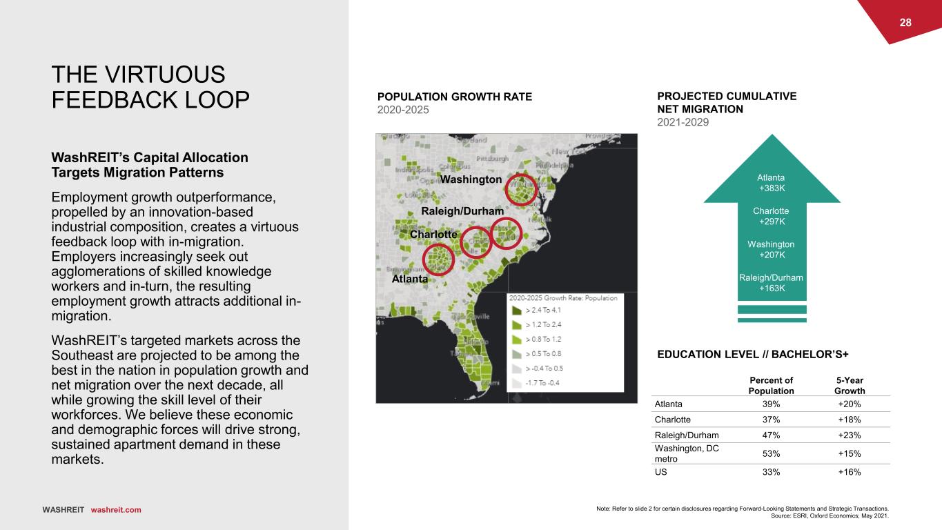 27 WASHREIT washreit.com TECH DRIVES GDP & EMPLOYMENT GROWTH Tech Metros Are Expected to Lead GDP and Job Growth Over the Medium Term Industrial mix of metro economies are expected to drive outperformance, with those economies with outsized exposure to tech and other innovation industries expected to outperform over the mid-term. WashREIT’s targeted markets across the Southeast are projected to be among the best in the nation in GDP and employment growth through 2025. We selected our future expansion markets that drive employment for renter cohorts that our strategies target, aiming to create sustained, long-term growth. Note: Refer to slide 2 for certain disclosures regarding Forward-Looking Statements and Strategic Transactions. Source: Oxford Economics, US Bureau of Economic Analysis; May 2021. GDP // 2020 – 2025 Major US Metros + US Overall EMPLOYMENT // 2020 – 2025 Major US Metros + US Overall Average Annual Growth % y/y WASHREIT washreit.com