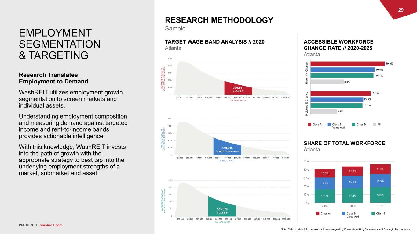 28 WASHREIT washreit.com Note: Refer to slide 2 for certain disclosures regarding Forward-Looking Statements and Strategic Transactions. Source: ESRI, Oxford Economics; May 2021. POPULATION GROWTH RATE 2020-2025 PROJECTED CUMULATIVE NET MIGRATION 2021-2029 Atlanta +383K Washington +207K Charlotte +297K Raleigh/Durham +163K Percent of Population 5-Year Growth Atlanta 39% +20% Charlotte 37% +18% Raleigh/Durham 47% +23% Washington, DC metro 53% +15% US 33% +16% EDUCATION LEVEL // BACHELOR’S+ THE VIRTUOUS FEEDBACK LOOP WashREIT’s Capital Allocation Targets Migration Patterns Employment growth outperformance, propelled by an innovation-based industrial composition, creates a virtuous feedback loop with in-migration. Employers increasingly seek out agglomerations of skilled knowledge workers and in-turn, the resulting employment growth attracts additional in- migration. WashREIT’s targeted markets across the Southeast are projected to be among the best in the nation in population growth and net migration over the next decade, all while growing the skill level of their workforces. We believe these economic and demographic forces will drive strong, sustained apartment demand in these markets. WASHREIT washreit.com Washington Raleigh/Durham Charlotte Atlanta
