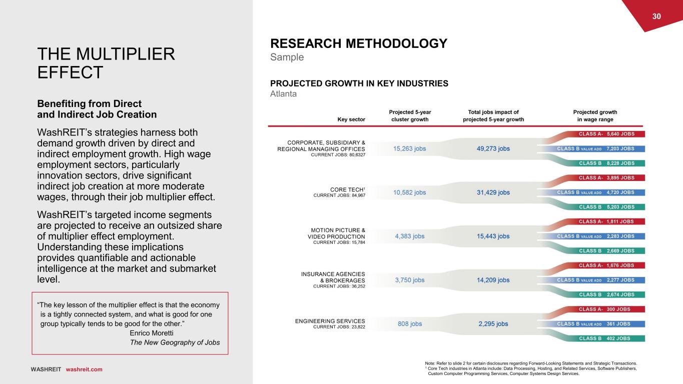 29 WASHREIT washreit.com Research Translates Employment to Demand WashREIT utilizes employment growth segmentation to screen markets and individual assets. Understanding employment composition and measuring demand against targeted income and rent-to-income bands provides actionable intelligence. With this knowledge, WashREIT invests into the path of growth with the appropriate strategy to best tap into the underlying employment strengths of a market, submarket and asset. EMPLOYMENT SEGMENTATION & TARGETING TARGET WAGE BAND ANALYSIS // 2020 Atlanta WASHREIT washreit.com ACCESSIBLE WORKFORCE CHANGE RATE // 2020-2025 Atlanta SHARE OF TOTAL WORKFORCE Atlanta 16.6% 17.8% 18.9% 14.1% 15.1% 16.0% 10.0% 11.0% 11.9% 0% 10% 20% 30% 40% 50% 2015 2020 2025 Class A- Class B Value-Add Class B Class A- Class B Value-Add Class B H is to ric % C ha ng e P ro je ct ed % C ha ng e 19.0% 16.4% 16.1% 8.5% 6.8% 13.3% 15.4% 13.5% All RESEARCH METHODOLOGY Sample Note: Refer to slide 2 for certain disclosures regarding Forward-Looking Statements and Strategic Transactions.