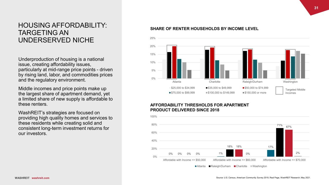 31 WASHREIT washreit.com 0% 5% 10% 15% 20% 25% Atlanta Charlotte Raleigh/Durham Washington $25,000 to $34,999 $35,000 to $49,999 $50,000 to $74,999 $75,000 to $99,999 $100,000 to $149,999 $150,000 or more Targeted Middle Incomes WASHREIT washreit.com HOUSING AFFORDABILITY: TARGETING AN UNDERSERVED NICHE Underproduction of housing is a national issue, creating affordability issues, particularly at mid-range price points - driven by rising land, labor, and commodities prices and the regulatory environment. Middle incomes and price points make up the largest share of apartment demand, yet a limited share of new supply is affordable to these renters. WashREIT’s strategies are focused on providing high quality homes and services to these residents while creating solid and consistent long-term investment returns for our investors. 0% 1% 17% 0% 18% 71% 0% 18% 67% 0% 0% 2% 0% 20% 40% 60% 80% 100% Affordable with Income <= $50,000 Affordable with Income <= $60,000 Affordable with Income <= $70,000 Atlanta Raleigh/Durham Charlotte Washington Source: U.S. Census, American Community Survey 2019, Real Page, WashREIT Research; May 2021. SHARE OF RENTER HOUSEHOLDS BY INCOME LEVEL AFFORDABILITY THRESHOLDS FOR APARTMENT PRODUCT DELIVERED SINCE 2018