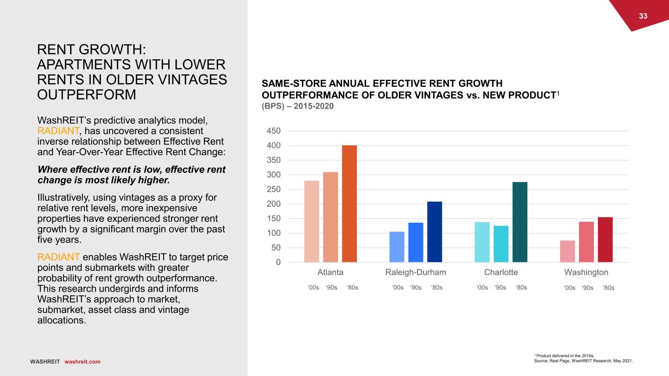 32 WASHREIT washreit.com 0% 2% 4% 6% 8% 10% 12% 14% 16% 18% 20% $- $700 $800 $900 $1,000 $1,100 $1,200 $1,300 $1,400 $1,500 $1,600 $1,700 $1,800 $1,900 $2,000 $2,100 $2,200 $2,300 $2,400 $2,500 $2,600 $2,700 $2,800 COMPETITIVE SUPPLY MITIGATION Total Market Distribution New Deliveries Distribution 2017-2021 110% of Market Median = $1,430 By targeting the lower range of Class A- rents priced below 110% of market median and Class B priced below 95% of market median, direct competition with new deliveries is minimized. Source: Real Page, WashREIT Research; May 2021. 95% of Market Median = $1,235 TOTAL MARKET RENT DISTRIBUTION VS. NEW PRODUCT DELIVERIES Atlanta Only 12% of new product delivers below 110% market median. Only 1% of new product delivers below 95% market median.