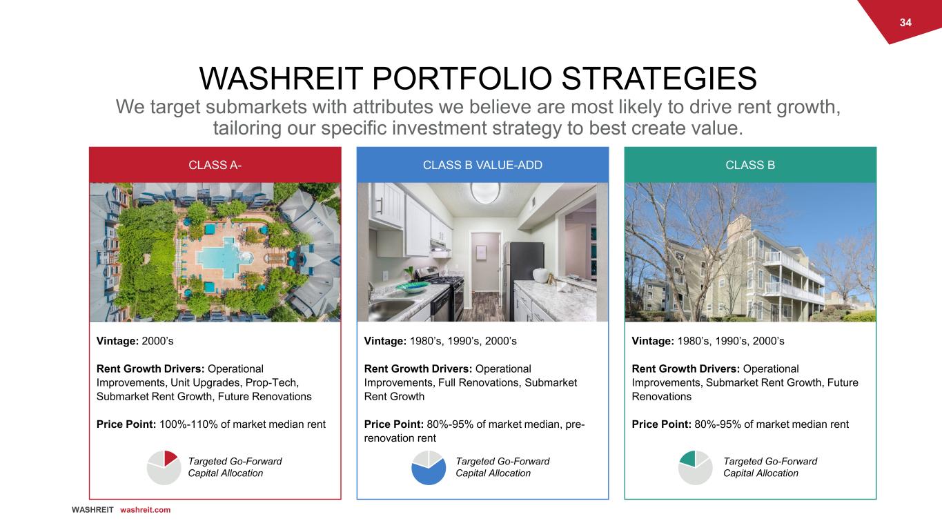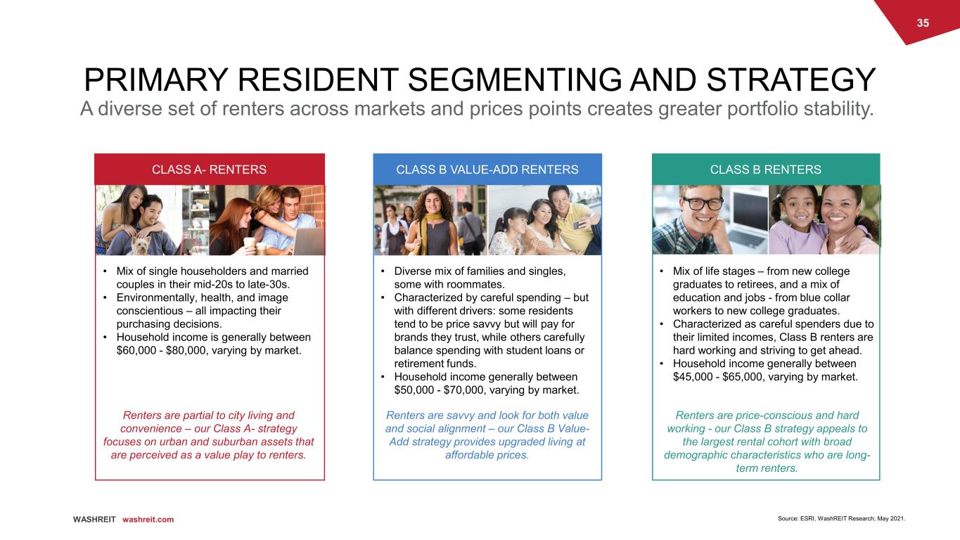 34 WASHREIT washreit.com WASHREIT PORTFOLIO STRATEGIES We target submarkets with attributes we believe are most likely to drive rent growth, tailoring our specific investment strategy to best create value. Vintage: 2000’s Rent Growth Drivers: Operational Improvements, Unit Upgrades, Prop-Tech, Submarket Rent Growth, Future Renovations Price Point: 100%-110% of market median rent Vintage: 1980’s, 1990’s, 2000’s Rent Growth Drivers: Operational Improvements, Full Renovations, Submarket Rent Growth Price Point: 80%-95% of market median, pre- renovation rent Vintage: 1980’s, 1990’s, 2000’s Rent Growth Drivers: Operational Improvements, Submarket Rent Growth, Future Renovations Price Point: 80%-95% of market median rent CLASS A- CLASS B VALUE-ADD CLASS B Targeted Go-Forward Capital Allocation Targeted Go-Forward Capital Allocation Targeted Go-Forward Capital Allocation
