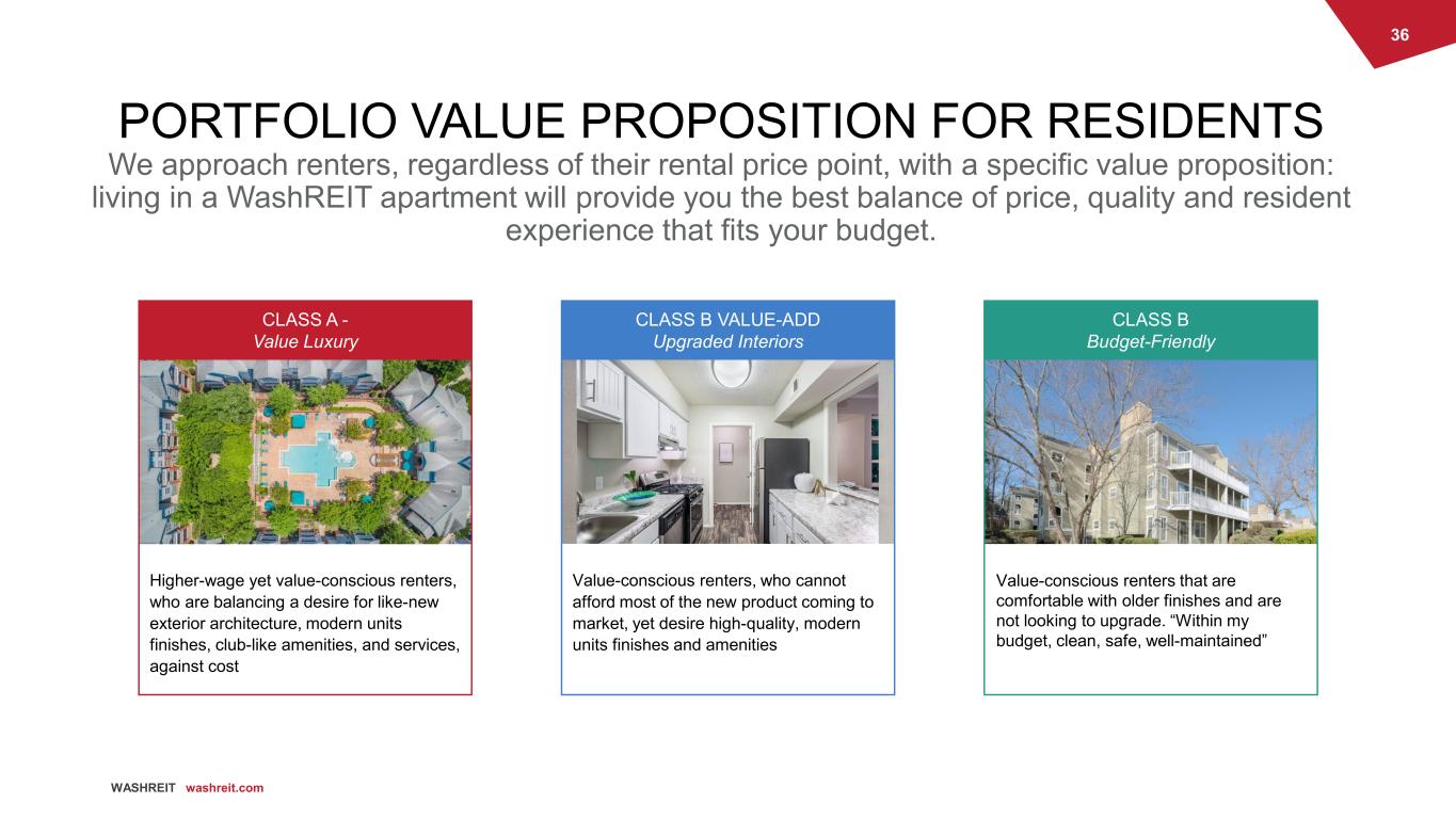 35 WASHREIT washreit.com PRIMARY RESIDENT SEGMENTING AND STRATEGY A diverse set of renters across markets and prices points creates greater portfolio stability. CLASS A- RENTERS CLASS B VALUE-ADD RENTERS CLASS B RENTERS • Mix of single householders and married couples in their mid-20s to late-30s. • Environmentally, health, and image conscientious – all impacting their purchasing decisions. • Household income is generally between $60,000 - $80,000, varying by market. • Diverse mix of families and singles, some with roommates. • Characterized by careful spending – but with different drivers: some residents tend to be price savvy but will pay for brands they trust, while others carefully balance spending with student loans or retirement funds. • Household income generally between $50,000 - $70,000, varying by market. • Mix of life stages – from new college graduates to retirees, and a mix of education and jobs - from blue collar workers to new college graduates. • Characterized as careful spenders due to their limited incomes, Class B renters are hard working and striving to get ahead. • Household income generally between $45,000 - $65,000, varying by market. Renters are partial to city living and convenience – our Class A- strategy focuses on urban and suburban assets that are perceived as a value play to renters. Renters are savvy and look for both value and social alignment – our Class B Value- Add strategy provides upgraded living at affordable prices. Renters are price-conscious and hard working - our Class B strategy appeals to the largest rental cohort with broad demographic characteristics who are long- term renters. Source: ESRI, WashREIT Research; May 2021.