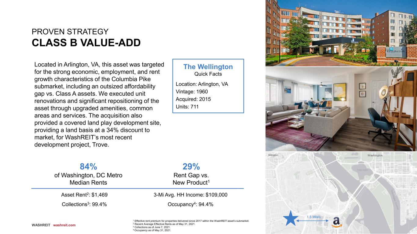 38 WASHREIT washreit.com PROVEN STRATEGY CLASS B VALUE-ADD The Wellington Quick Facts Location: Arlington, VA Vintage: 1960 Acquired: 2015 Units: 711 Located in Arlington, VA, this asset was targeted for the strong economic, employment, and rent growth characteristics of the Columbia Pike submarket, including an outsized affordability gap vs. Class A assets. We executed unit renovations and significant repositioning of the asset through upgraded amenities, common areas and services. The acquisition also provided a covered land play development site, providing a land basis at a 34% discount to market, for WashREIT’s most recent development project, Trove. 84% of Washington, DC Metro Median Rents 29% Rent Gap vs. New Product1 1.5 Miles Asset Rent2: $1,469 3-Mi Avg. HH Income: $109,000 Collections3: 99.4% Occupancy4: 94.4% 1 Effective rent premium for properties delivered since 2017 within the WashREIT asset’s submarket. 2 Recent Average Effective Rents as of May 31, 2021. 3 Collections as of June 7, 2021. 4 Occupancy as of May 31, 2021.
