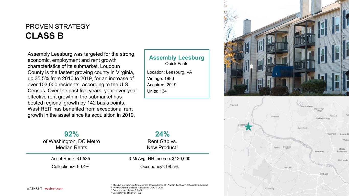 39 WASHREIT washreit.com PROVEN STRATEGY CLASS B Assembly Leesburg Quick Facts Location: Leesburg, VA Vintage: 1986 Acquired: 2019 Units: 134 Assembly Leesburg was targeted for the strong economic, employment and rent growth characteristics of its submarket. Loudoun County is the fastest growing county in Virginia, up 35.5% from 2010 to 2019, for an increase of over 103,000 residents, according to the U.S. Census. Over the past five years, year-over-year effective rent growth in the submarket has bested regional growth by 142 basis points. WashREIT has benefited from exceptional rent growth in the asset since its acquisition in 2019. 92% of Washington, DC Metro Median Rents 24% Rent Gap vs. New Product1 Asset Rent2: $1,535 3-Mi Avg. HH Income: $120,000 Collections3: 99.4% Occupancy4: 98.5% 1 Effective rent premium for properties delivered since 2017 within the WashREIT asset’s submarket. 2 Recent Average Effective Rents as of May 31, 2021. 3 Collections as of June 7, 2021. 4 Occupancy as of May 31, 2021.