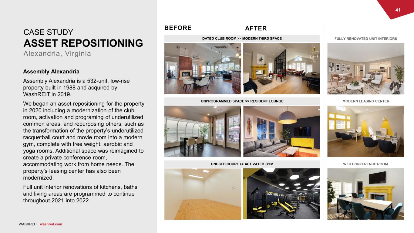 40 WASHREIT washreit.com VALUE-ADD PROGRAMS FULL RENOVATION KEY METRICS Avg. cost per unit $18-$22,000 $10-$13,000 $5-$7,000 Avg. monthly premium $260 $110 $100 ROI 14%-15% 10%-11% 18%-20% BEFORE UNIT UPGRADES Current Opportunity + ~2,800-unit renovation pipeline + Historically, ~600 unit renovations per year Methodology + Research-driven capital allocation + COVID-19 pause with strategic restart in 2021 + Scope tailored to submarket and individual asset + Returns Threshold: 10%-20% in current environment Status + Remobilized and capitalizing on suburban demand Going Forward, We Plan To + Execute program in existing Washington, DC metro pipeline + Expand Value-Add B in the Southeast + Expanding pipeline for future renovation growth through our Class A- Strategy SCOPE Appliances, counter-top replacement, new cabinetry, kitchen backsplash, open format kitchen, plumbing fixture updates, light package, flooring Appliances, counter-top replacement, cabinetry doors, plumbing fixture updates, light package, flooring One of the following: Appliances, counter-top replacement, cabinetry doors, plumbing fixture updates, light package, flooring TRACK RECORD 2015-2021 Units Completed 1,163 661 >1,000 AFTER Renovation programs create an improved living experience while generating strong returns WASHREIT washreit.com