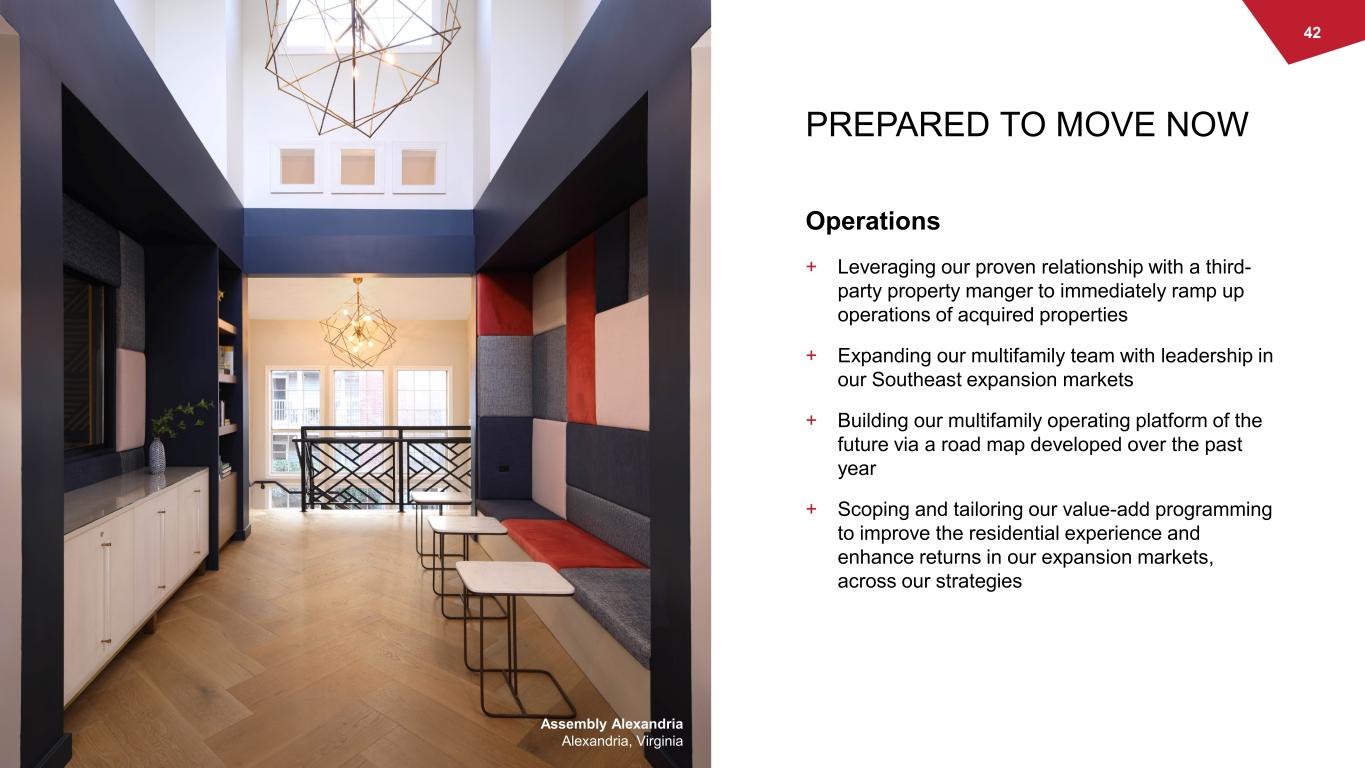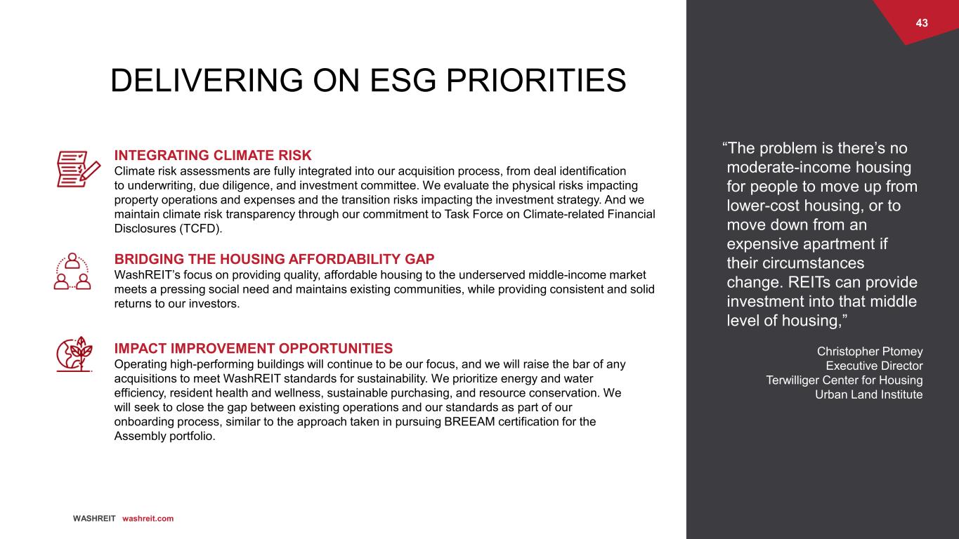 42 WASHREIT washreit.com PREPARED TO MOVE NOW + Leveraging our proven relationship with a third- party property manger to immediately ramp up operations of acquired properties + Expanding our multifamily team with leadership in our Southeast expansion markets + Building our multifamily operating platform of the future via a road map developed over the past year + Scoping and tailoring our value-add programming to improve the residential experience and enhance returns in our expansion markets, across our strategies Assembly Alexandria Alexandria, Virginia Operations