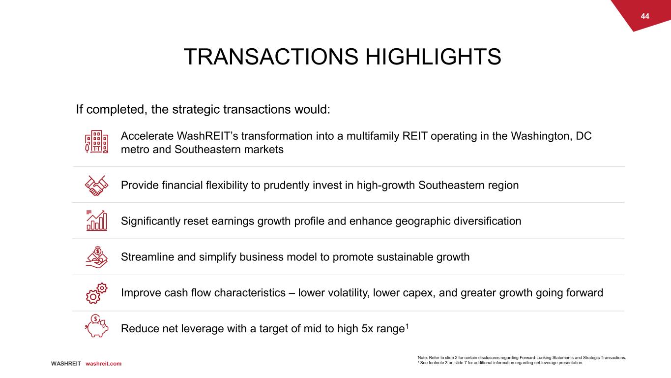 44 WASHREIT washreit.com Accelerate WashREIT’s transformation into a multifamily REIT operating in the Washington, DC metro and Southeastern markets Provide financial flexibility to prudently invest in high-growth Southeastern region Significantly reset earnings growth profile and enhance geographic diversification Streamline and simplify business model to promote sustainable growth Improve cash flow characteristics – lower volatility, lower capex, and greater growth going forward Reduce net leverage with a target of mid to high 5x range1 1 Act TRANSACTIONS HIGHLIGHTS If completed, the strategic transactions would: Note: Refer to slide 2 for certain disclosures regarding Forward-Looking Statements and Strategic Transactions. 1 See footnote 3 on slide 7 for additional information regarding net leverage presentation.