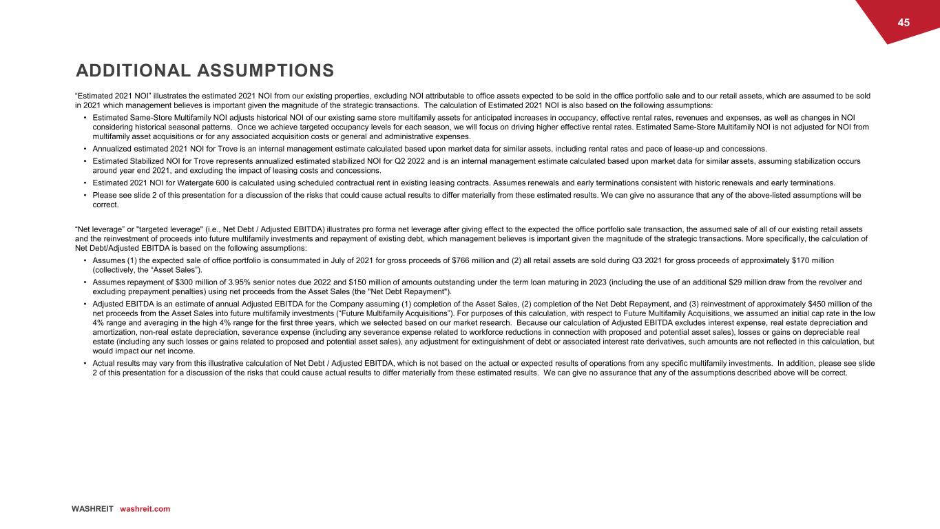 45 WASHREIT washreit.com “Estimated 2021 NOI” illustrates the estimated 2021 NOI from our existing properties, excluding NOI attributable to office assets expected to be sold in the office portfolio sale and to our retail assets, which are assumed to be sold in 2021 which management believes is important given the magnitude of the strategic transactions. The calculation of Estimated 2021 NOI is also based on the following assumptions: • Estimated Same-Store Multifamily NOI adjusts historical NOI of our existing same store multifamily assets for anticipated increases in occupancy, effective rental rates, revenues and expenses, as well as changes in NOI considering historical seasonal patterns. Once we achieve targeted occupancy levels for each season, we will focus on driving higher effective rental rates. Estimated Same-Store Multifamily NOI is not adjusted for NOI from multifamily asset acquisitions or for any associated acquisition costs or general and administrative expenses. • Annualized estimated 2021 NOI for Trove is an internal management estimate calculated based upon market data for similar assets, including rental rates and pace of lease-up and concessions. • Estimated Stabilized NOI for Trove represents annualized estimated stabilized NOI for Q2 2022 and is an internal management estimate calculated based upon market data for similar assets, assuming stabilization occurs around year end 2021, and excluding the impact of leasing costs and concessions. • Estimated 2021 NOI for Watergate 600 is calculated using scheduled contractual rent in existing leasing contracts. Assumes renewals and early terminations consistent with historic renewals and early terminations. • Please see slide 2 of this presentation for a discussion of the risks that could cause actual results to differ materially from these estimated results. We can give no assurance that any of the above-listed assumptions will be correct. “Net leverage” or "targeted leverage" (i.e., Net Debt / Adjusted EBITDA) illustrates pro forma net leverage after giving effect to the expected the office portfolio sale transaction, the assumed sale of all of our existing retail assets and the reinvestment of proceeds into future multifamily investments and repayment of existing debt, which management believes is important given the magnitude of the strategic transactions. More specifically, the calculation of Net Debt/Adjusted EBITDA is based on the following assumptions: • Assumes (1) the expected sale of office portfolio is consummated in July of 2021 for gross proceeds of $766 million and (2) all retail assets are sold during Q3 2021 for gross proceeds of approximately $170 million (collectively, the “Asset Sales”). • Assumes repayment of $300 million of 3.95% senior notes due 2022 and $150 million of amounts outstanding under the term loan maturing in 2023 (including the use of an additional $29 million draw from the revolver and excluding prepayment penalties) using net proceeds from the Asset Sales (the "Net Debt Repayment"). • Adjusted EBITDA is an estimate of annual Adjusted EBITDA for the Company assuming (1) completion of the Asset Sales, (2) completion of the Net Debt Repayment, and (3) reinvestment of approximately $450 million of the net proceeds from the Asset Sales into future multifamily investments (“Future Multifamily Acquisitions”). For purposes of this calculation, with respect to Future Multifamily Acquisitions, we assumed an initial cap rate in the low 4% range and averaging in the high 4% range for the first three years, which we selected based on our market research. Because our calculation of Adjusted EBITDA excludes interest expense, real estate depreciation and amortization, non-real estate depreciation, severance expense (including any severance expense related to workforce reductions in connection with proposed and potential asset sales), losses or gains on depreciable real estate (including any such losses or gains related to proposed and potential asset sales), any adjustment for extinguishment of debt or associated interest rate derivatives, such amounts are not reflected in this calculation, but would impact our net income. • Actual results may vary from this illustrative calculation of Net Debt / Adjusted EBITDA, which is not based on the actual or expected results of operations from any specific multifamily investments. In addition, please see slide 2 of this presentation for a discussion of the risks that could cause actual results to differ materially from these estimated results. We can give no assurance that any of the assumptions described above will be correct. ADDITIONAL ASSUMPTIONS