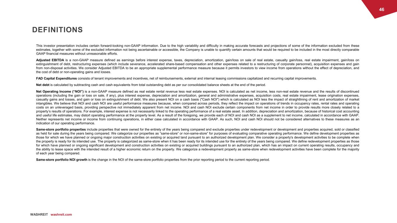 46 WASHREIT washreit.com DEFINITIONS This investor presentation includes certain forward-looking non-GAAP information. Due to the high variability and difficulty in making accurate forecasts and projections of some of the information excluded from these estimates, together with some of the excluded information not being ascertainable or accessible, the Company is unable to quantify certain amounts that would be required to be included in the most directly comparable GAAP financial measures without unreasonable efforts. Adjusted EBITDA is a non-GAAP measure defined as earnings before interest expense, taxes, depreciation, amortization, gain/loss on sale of real estate, casualty gain/loss, real estate impairment, gain/loss on extinguishment of debt, restructuring expenses (which include severance, accelerated share-based compensation and other expenses related to a restructuring of corporate personnel), acquisition expenses and gain from non-disposal activities. We consider Adjusted EBITDA to be an appropriate supplemental performance measure because it permits investors to view income from operations without the effect of depreciation, and the cost of debt or non-operating gains and losses. FAD Capital Expenditures consists of tenant improvements and incentives, net of reimbursements, external and internal leasing commissions capitalized and recurring capital improvements. Net debt is calculated by subtracting cash and cash equivalents from total outstanding debt as per our consolidated balance sheets at the end of the period. Net Operating Income (“NOI”) is a non-GAAP measure defined as real estate rental revenue less real estate expenses. NOI is calculated as net income, less non-real estate revenue and the results of discontinued operations (including the gain or loss on sale, if any), plus interest expense, depreciation and amortization, general and administrative expenses, acquisition costs, real estate impairment, lease origination expenses, casualty gains and losses, and gain or loss on extinguishment of debt. We also present NOI on a cash basis ("Cash NOI") which is calculated as NOI less the impact of straightlining of rent and amortization of market intangibles. We believe that NOI and cash NOI are useful performance measures because, when compared across periods, they reflect the impact on operations of trends in occupancy rates, rental rates and operating costs on an unleveraged basis, providing perspective not immediately apparent from net income. NOI and cash NOI exclude certain components from net income in order to provide results more closely related to a property’s results of operations. For example, interest expense is not necessarily linked to the operating performance of a real estate asset. In addition, depreciation and amortization, because of historical cost accounting and useful life estimates, may distort operating performance at the property level. As a result of the foregoing, we provide each of NOI and cash NOI as a supplement to net income, calculated in accordance with GAAP. Neither represents net income or income from continuing operations, in either case calculated in accordance with GAAP. As such, NOI and cash NOI should not be considered alternatives to these measures as an indication of our operating performance. Same-store portfolio properties include properties that were owned for the entirety of the years being compared and exclude properties under redevelopment or development and properties acquired, sold or classified as held for sale during the years being compared. We categorize our properties as “same-store” or non-same-store” for purposes of evaluating comparative operating performance. We define development properties as those for which we have planned or ongoing major construction activities on existing or acquired land pursuant to an authorized development plan. We consider a property's development activities to be complete when the property is ready for its intended use. The property is categorized as same-store when it has been ready for its intended use for the entirety of the years being compared. We define redevelopment properties as those for which have planned or ongoing significant development and construction activities on existing or acquired buildings pursuant to an authorized plan, which has an impact on current operating results, occupancy and the ability to lease space with the intended result of a higher economic return on the property. We categorize a redevelopment property as same-store when redevelopment activities have been complete for the majority of each year being compared. Same-store portfolio NOI growth is the change in the NOI of the same-store portfolio properties from the prior reporting period to the current reporting period.