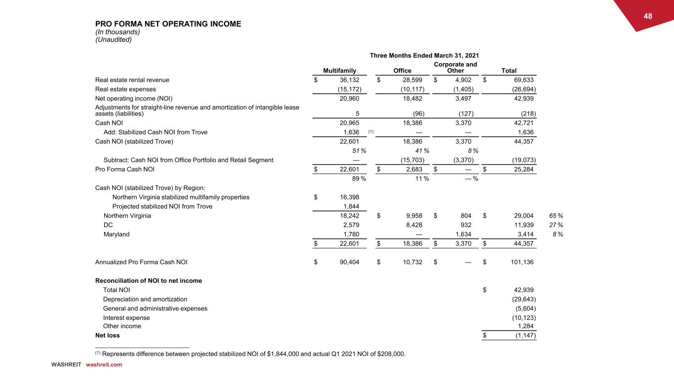 48 WASHREIT washreit.com PRO FORMA NET OPERATING INCOME (In thousands) (Unaudited) Three Months Ended March 31, 2021 Multifamily Office Corporate and Other Total Real estate rental revenue $ 36,132 $ 28,599 $ 4,902 $ 69,633 Real estate expenses (15,172) (10,117) (1,405) (26,694) Net operating income (NOI) 20,960 18,482 3,497 42,939 Adjustments for straight-line revenue and amortization of intangible lease assets (liabilities) 5 (96) (127) (218) Cash NOI 20,965 18,386 3,370 42,721 Add: Stabilized Cash NOI from Trove 1,636 (1) — — 1,636 Cash NOI (stabilized Trove) 22,601 18,386 3,370 44,357 51 % 41 % 8 % Subtract: Cash NOI from Office Portfolio and Retail Segment — (15,703) (3,370) (19,073) Pro Forma Cash NOI $ 22,601 $ 2,683 $ — $ 25,284 89 % 11 % — % Cash NOI (stabilized Trove) by Region: Northern Virginia stabilized multifamily properties $ 16,398 Projected stabilized NOI from Trove 1,844 Northern Virginia 18,242 $ 9,958 $ 804 $ 29,004 65 % DC 2,579 8,428 932 11,939 27 % Maryland 1,780 — 1,634 3,414 8 % $ 22,601 $ 18,386 $ 3,370 $ 44,357 Annualized Pro Forma Cash NOI $ 90,404 $ 10,732 $ — $ 101,136 Reconciliation of NOI to net income Total NOI $ 42,939 Depreciation and amortization (29,643) General and administrative expenses (5,604) Interest expense (10,123) Other income 1,284 Net loss $ (1,147) ______________________________ (1) Represents difference between projected stabilized NOI of $1,844,000 and actual Q1 2021 NOI of $208,000.