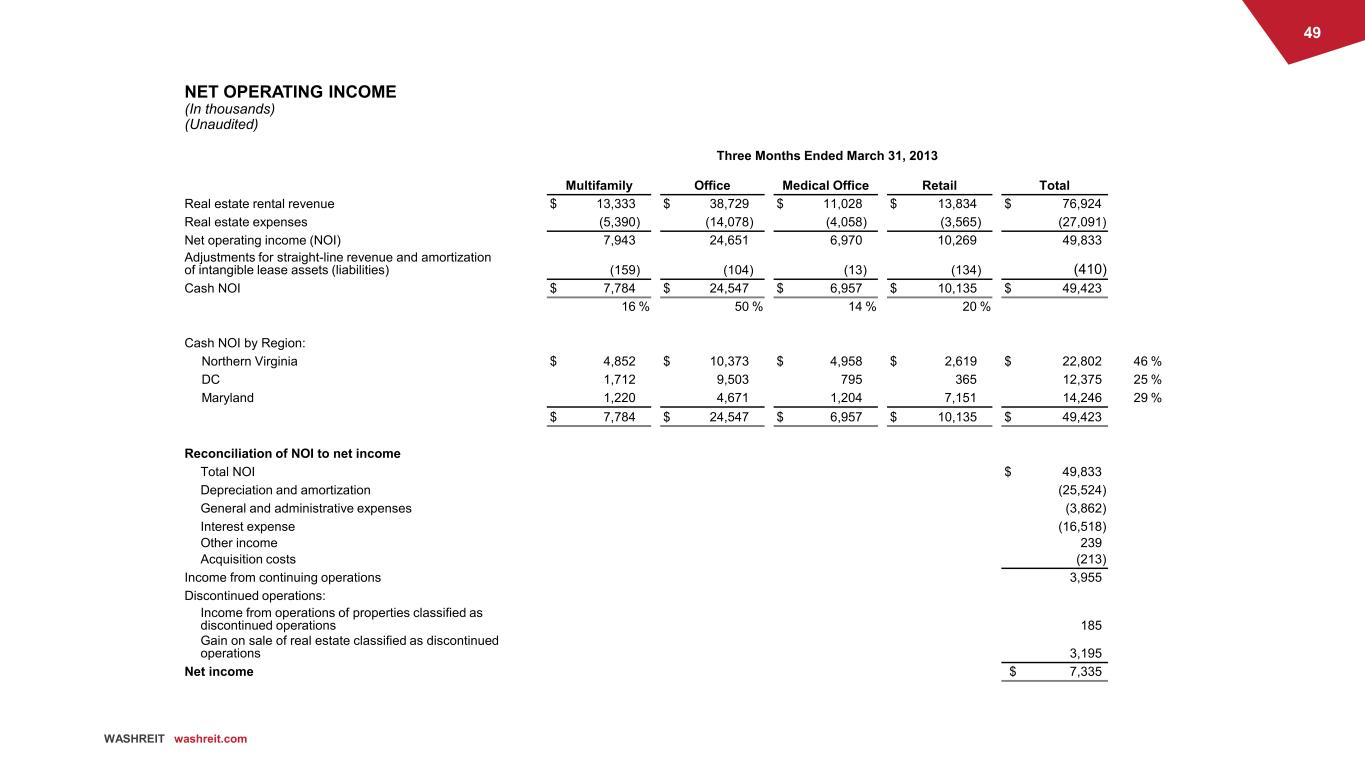 49 WASHREIT washreit.com NET OPERATING INCOME (In thousands) (Unaudited) Three Months Ended March 31, 2013 Multifamily Office Medical Office Retail Total Real estate rental revenue $ 13,333 $ 38,729 $ 11,028 $ 13,834 $ 76,924 Real estate expenses (5,390) (14,078) (4,058) (3,565) (27,091) Net operating income (NOI) 7,943 24,651 6,970 10,269 49,833 Adjustments for straight-line revenue and amortization of intangible lease assets (liabilities) (159) (104) (13) (134) (410) Cash NOI $ 7,784 $ 24,547 $ 6,957 $ 10,135 $ 49,423 16 % 50 % 14 % 20 % Cash NOI by Region: Northern Virginia $ 4,852 $ 10,373 $ 4,958 $ 2,619 $ 22,802 46 % DC 1,712 9,503 795 365 12,375 25 % Maryland 1,220 4,671 1,204 7,151 14,246 29 % $ 7,784 $ 24,547 $ 6,957 $ 10,135 $ 49,423 Reconciliation of NOI to net income Total NOI $ 49,833 Depreciation and amortization (25,524) General and administrative expenses (3,862) Interest expense (16,518) Other income 239 Acquisition costs (213) Income from continuing operations 3,955 Discontinued operations: Income from operations of properties classified as discontinued operations 185 Gain on sale of real estate classified as discontinued operations 3,195 Net income $ 7,335