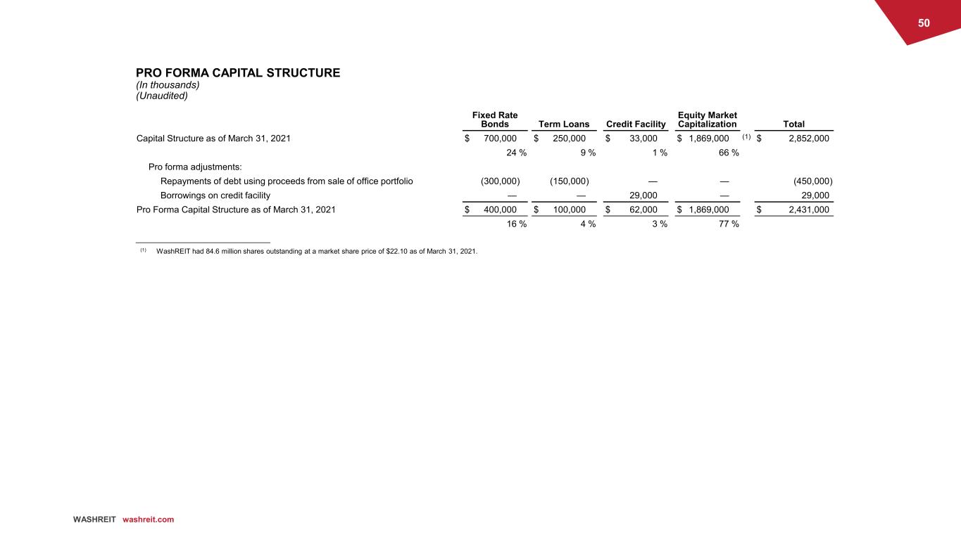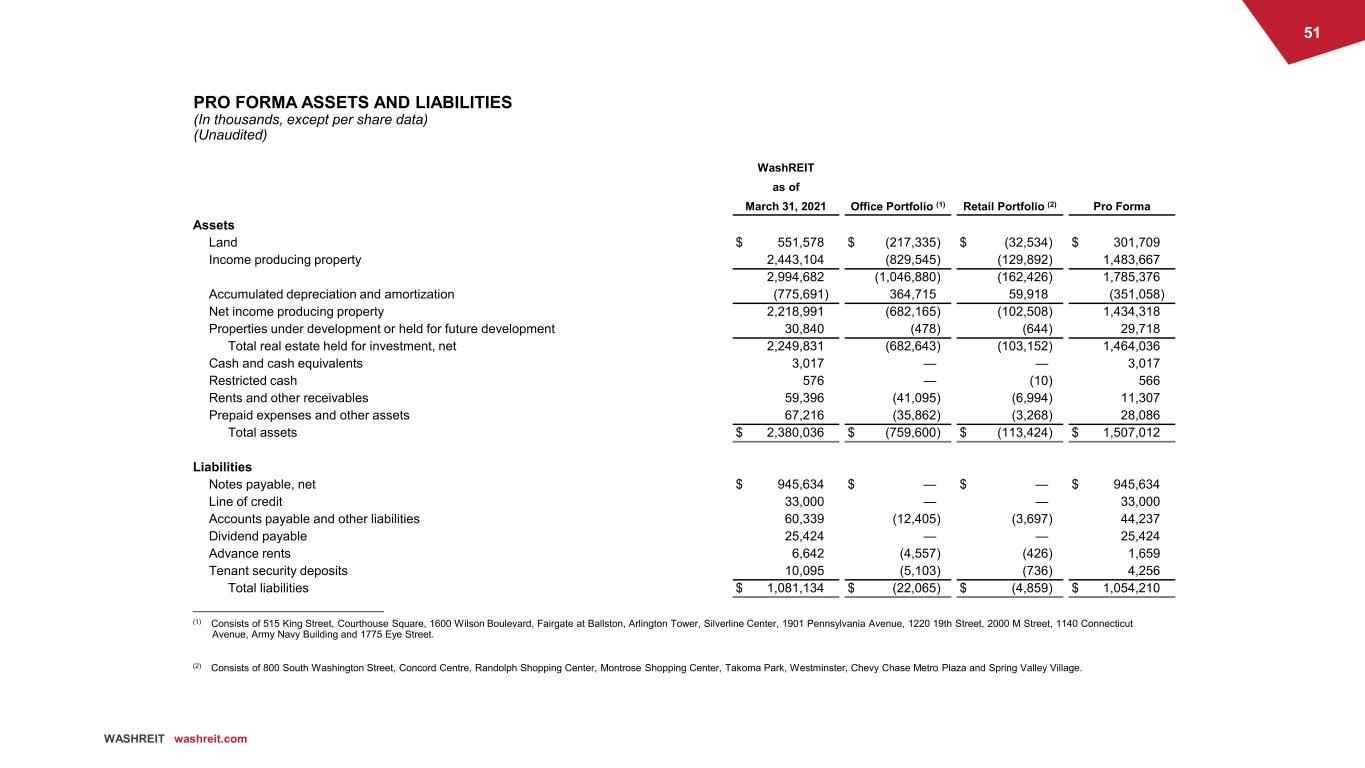 50 WASHREIT washreit.com PRO FORMA CAPITAL STRUCTURE (In thousands) (Unaudited) Fixed Rate Bonds Term Loans Credit Facility Equity Market Capitalization Total Capital Structure as of March 31, 2021 $ 700,000 $ 250,000 $ 33,000 $ 1,869,000 (1) $ 2,852,000 24 % 9 % 1 % 66 % Pro forma adjustments: Repayments of debt using proceeds from sale of office portfolio (300,000) (150,000) — — (450,000) Borrowings on credit facility — — 29,000 — 29,000 Pro Forma Capital Structure as of March 31, 2021 $ 400,000 $ 100,000 $ 62,000 $ 1,869,000 $ 2,431,000 16 % 4 % 3 % 77 % ______________________________ (1) WashREIT had 84.6 million shares outstanding at a market share price of $22.10 as of March 31, 2021.