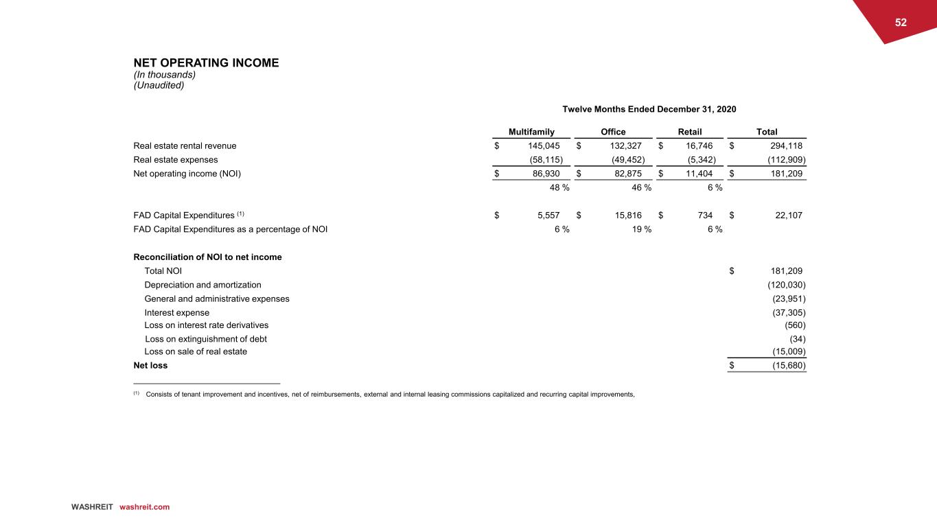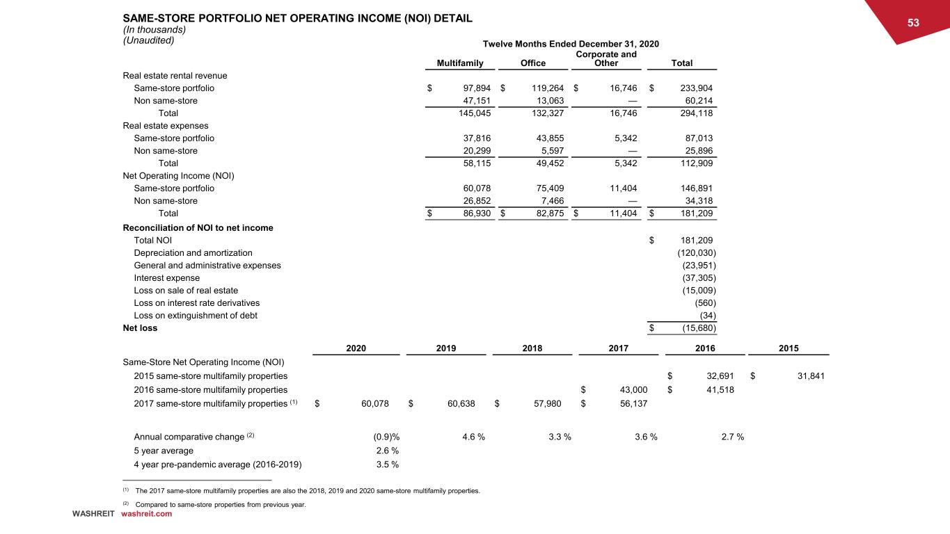 52 WASHREIT washreit.com NET OPERATING INCOME (In thousands) (Unaudited) Twelve Months Ended December 31, 2020 Multifamily Office Retail Total Real estate rental revenue $ 145,045 $ 132,327 $ 16,746 $ 294,118 Real estate expenses (58,115) (49,452) (5,342) (112,909) Net operating income (NOI) $ 86,930 $ 82,875 $ 11,404 $ 181,209 48 % 46 % 6 % FAD Capital Expenditures (1) $ 5,557 $ 15,816 $ 734 $ 22,107 FAD Capital Expenditures as a percentage of NOI 6 % 19 % 6 % Reconciliation of NOI to net income Total NOI $ 181,209 Depreciation and amortization (120,030) General and administrative expenses (23,951) Interest expense (37,305) Loss on interest rate derivatives (560) Loss on extinguishment of debt (34) Loss on sale of real estate (15,009) Net loss $ (15,680) ______________________________ (1) Consists of tenant improvement and incentives, net of reimbursements, external and internal leasing commissions capitalized and recurring capital improvements,