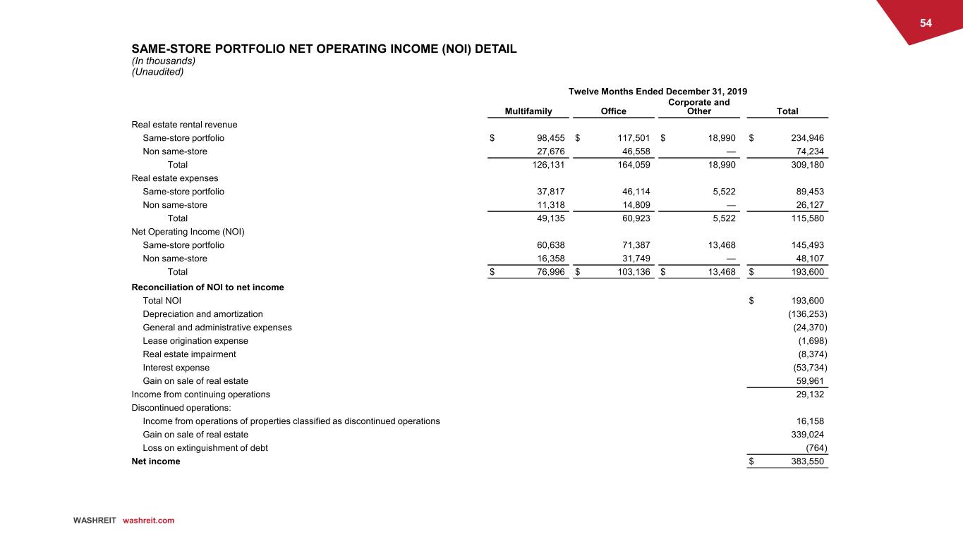53 WASHREIT washreit.com SAME-STORE PORTFOLIO NET OPERATING INCOME (NOI) DETAIL (In thousands) (Unaudited) Twelve Months Ended December 31, 2020 Multifamily Office Corporate and Other Total Real estate rental revenue Same-store portfolio $ 97,894 $ 119,264 $ 16,746 $ 233,904 Non same-store 47,151 13,063 — 60,214 Total 145,045 132,327 16,746 294,118 Real estate expenses Same-store portfolio 37,816 43,855 5,342 87,013 Non same-store 20,299 5,597 — 25,896 Total 58,115 49,452 5,342 112,909 Net Operating Income (NOI) Same-store portfolio 60,078 75,409 11,404 146,891 Non same-store 26,852 7,466 — 34,318 Total $ 86,930 $ 82,875 $ 11,404 $ 181,209 Reconciliation of NOI to net income Total NOI $ 181,209 Depreciation and amortization (120,030) General and administrative expenses (23,951) Interest expense (37,305) Loss on sale of real estate (15,009) Loss on interest rate derivatives (560) Loss on extinguishment of debt (34) Net loss $ (15,680) 2020 2019 2018 2017 2016 2015 Same-Store Net Operating Income (NOI) 2015 same-store multifamily properties $ 32,691 $ 31,841 2016 same-store multifamily properties $ 43,000 $ 41,518 2017 same-store multifamily properties (1) $ 60,078 $ 60,638 $ 57,980 $ 56,137 Annual comparative change (2) (0.9)% 4.6 % 3.3 % 3.6 % 2.7 % 5 year average 2.6 % 4 year pre-pandemic average (2016-2019) 3.5 % ______________________________ (1) The 2017 same-store multifamily properties are also the 2018, 2019 and 2020 same-store multifamily properties. (2) Compared to same-store properties from previous year.
