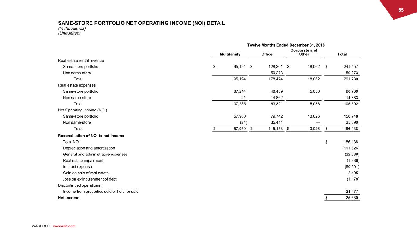 54 WASHREIT washreit.com SAME-STORE PORTFOLIO NET OPERATING INCOME (NOI) DETAIL (In thousands) (Unaudited) Twelve Months Ended December 31, 2019 Multifamily Office Corporate and Other Total Real estate rental revenue Same-store portfolio $ 98,455 $ 117,501 $ 18,990 $ 234,946 Non same-store 27,676 46,558 — 74,234 Total 126,131 164,059 18,990 309,180 Real estate expenses Same-store portfolio 37,817 46,114 5,522 89,453 Non same-store 11,318 14,809 — 26,127 Total 49,135 60,923 5,522 115,580 Net Operating Income (NOI) Same-store portfolio 60,638 71,387 13,468 145,493 Non same-store 16,358 31,749 — 48,107 Total $ 76,996 $ 103,136 $ 13,468 $ 193,600 Reconciliation of NOI to net income Total NOI $ 193,600 Depreciation and amortization (136,253) General and administrative expenses (24,370) Lease origination expense (1,698) Real estate impairment (8,374) Interest expense (53,734) Gain on sale of real estate 59,961 Income from continuing operations 29,132 Discontinued operations: Income from operations of properties classified as discontinued operations 16,158 Gain on sale of real estate 339,024 Loss on extinguishment of debt (764) Net income $ 383,550