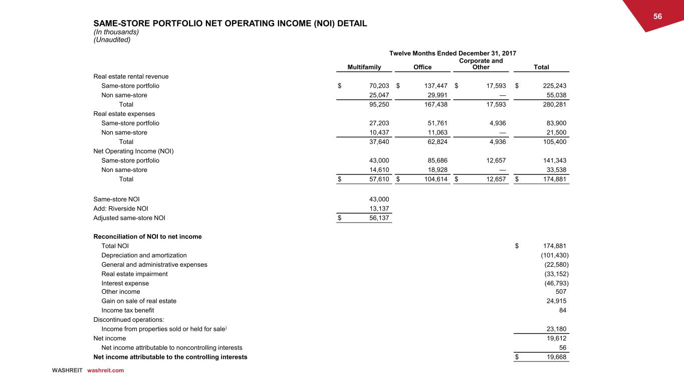 55 WASHREIT washreit.com SAME-STORE PORTFOLIO NET OPERATING INCOME (NOI) DETAIL (In thousands) (Unaudited) Twelve Months Ended December 31, 2018 Multifamily Office Corporate and Other Total Real estate rental revenue Same-store portfolio $ 95,194 $ 128,201 $ 18,062 $ 241,457 Non same-store — 50,273 — 50,273 Total 95,194 178,474 18,062 291,730 Real estate expenses Same-store portfolio 37,214 48,459 5,036 90,709 Non same-store 21 14,862 — 14,883 Total 37,235 63,321 5,036 105,592 Net Operating Income (NOI) Same-store portfolio 57,980 79,742 13,026 150,748 Non same-store (21) 35,411 — 35,390 Total $ 57,959 $ 115,153 $ 13,026 $ 186,138 Reconciliation of NOI to net income Total NOI $ 186,138 Depreciation and amortization (111,826) General and administrative expenses (22,089) Real estate impairment (1,886) Interest expense (50,501) Gain on sale of real estate 2,495 Loss on extinguishment of debt (1,178) Discontinued operations: Income from properties sold or held for sale 24,477 Net income $ 25,630
