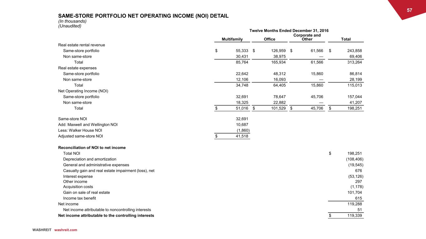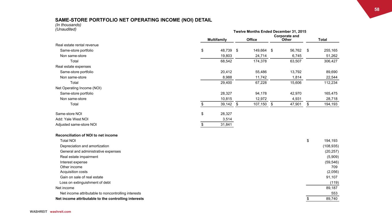 57 WASHREIT washreit.com SAME-STORE PORTFOLIO NET OPERATING INCOME (NOI) DETAIL (In thousands) (Unaudited) Twelve Months Ended December 31, 2016 Multifamily Office Corporate and Other Total Real estate rental revenue Same-store portfolio $ 55,333 $ 126,959 $ 61,566 $ 243,858 Non same-store 30,431 38,975 — 69,406 Total 85,764 165,934 61,566 313,264 Real estate expenses Same-store portfolio 22,642 48,312 15,860 86,814 Non same-store 12,106 16,093 — 28,199 Total 34,748 64,405 15,860 115,013 Net Operating Income (NOI) Same-store portfolio 32,691 78,647 45,706 157,044 Non same-store 18,325 22,882 — 41,207 Total $ 51,016 $ 101,529 $ 45,706 $ 198,251 Same-store NOI 32,691 Add: Maxwell and Wellington NOI 10,687 Less: Walker House NOI (1,860) Adjusted same-store NOI $ 41,518 Reconciliation of NOI to net income Total NOI $ 198,251 Depreciation and amortization (108,406) General and administrative expenses (19,545) Casualty gain and real estate impairment (loss), net 676 Interest expense (53,126) Other income 297 Acquisition costs (1,178) Gain on sale of real estate 101,704 Income tax benefit 615 Net income 119,288 Net income attributable to noncontrolling interests 51 Net income attributable to the controlling interests $ 119,339