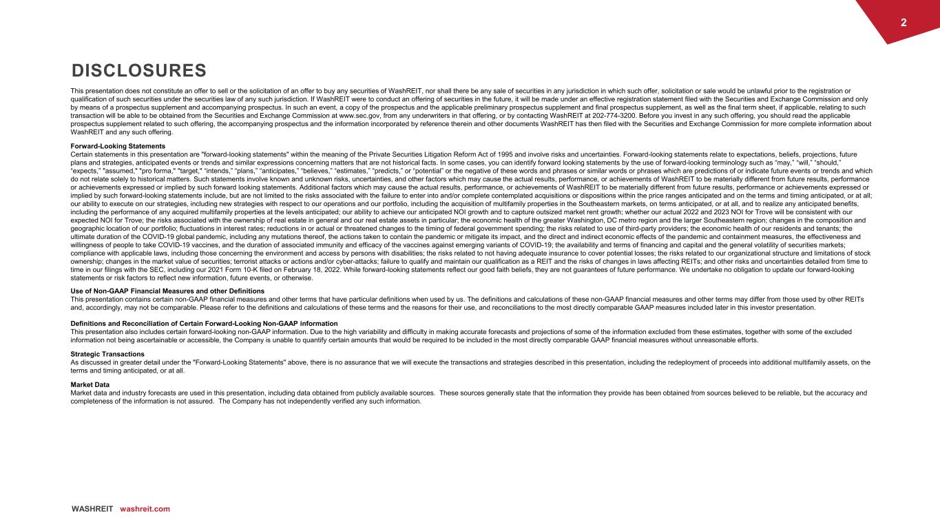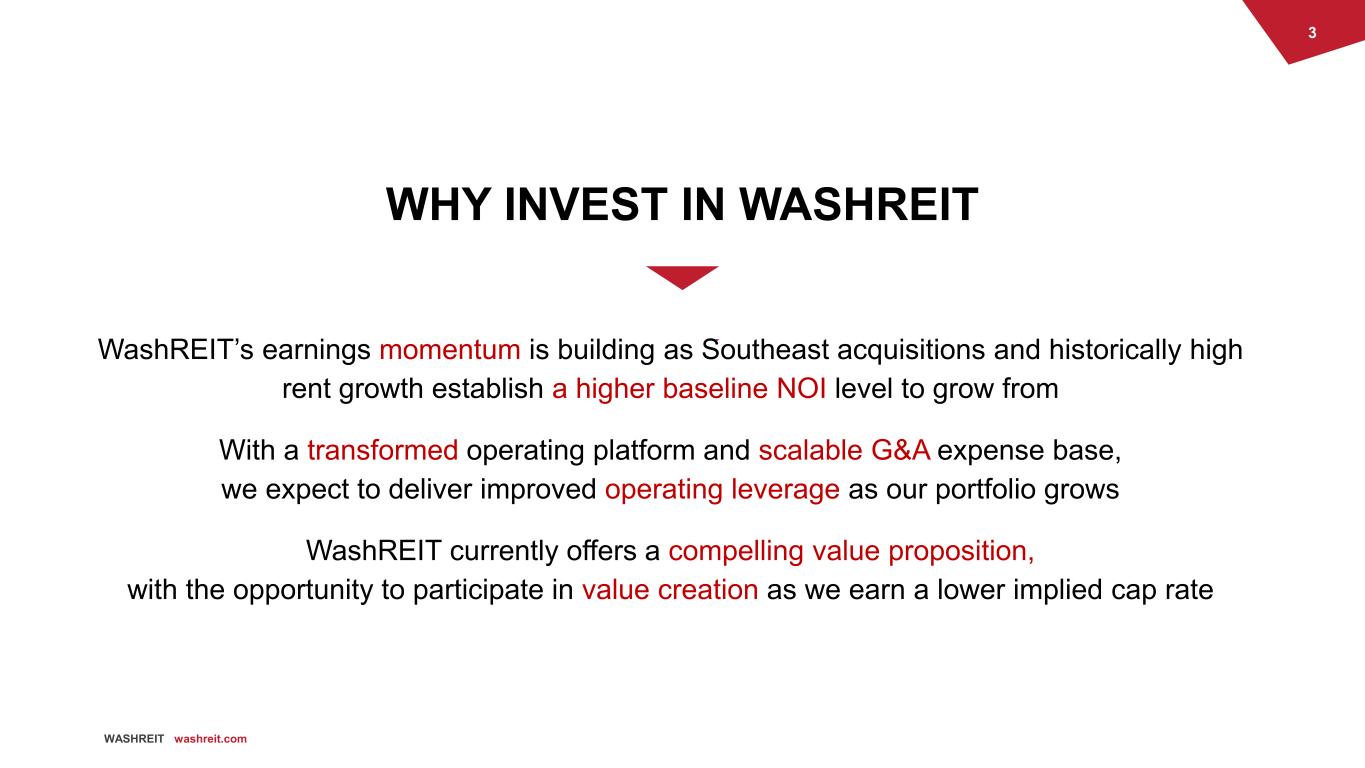 2 WASHREIT washreit.com This presentation does not constitute an offer to sell or the solicitation of an offer to buy any securities of WashREIT, nor shall there be any sale of securities in any jurisdiction in which such offer, solicitation or sale would be unlawful prior to the registration or qualification of such securities under the securities law of any such jurisdiction. If WashREIT were to conduct an offering of securities in the future, it will be made under an effective registration statement filed with the Securities and Exchange Commission and only by means of a prospectus supplement and accompanying prospectus. In such an event, a copy of the prospectus and the applicable preliminary prospectus supplement and final prospectus supplement, as well as the final term sheet, if applicable, relating to such transaction will be able to be obtained from the Securities and Exchange Commission at www.sec.gov, from any underwriters in that offering, or by contacting WashREIT at 202-774-3200. Before you invest in any such offering, you should read the applicable prospectus supplement related to such offering, the accompanying prospectus and the information incorporated by reference therein and other documents WashREIT has then filed with the Securities and Exchange Commission for more complete information about WashREIT and any such offering. Forward-Looking Statements Certain statements in this presentation are "forward-looking statements" within the meaning of the Private Securities Litigation Reform Act of 1995 and involve risks and uncertainties. Forward-looking statements relate to expectations, beliefs, projections, future plans and strategies, anticipated events or trends and similar expressions concerning matters that are not historical facts. In some cases, you can identify forward looking statements by the use of forward-looking terminology such as “may,” “will,” “should,” “expects,” "assumed," "pro forma," "target," “intends,” “plans,” “anticipates,” “believes,” “estimates,” “predicts,” or “potential” or the negative of these words and phrases or similar words or phrases which are predictions of or indicate future events or trends and which do not relate solely to historical matters. Such statements involve known and unknown risks, uncertainties, and other factors which may cause the actual results, performance, or achievements of WashREIT to be materially different from future results, performance or achievements expressed or implied by such forward looking statements. Additional factors which may cause the actual results, performance, or achievements of WashREIT to be materially different from future results, performance or achievements expressed or implied by such forward-looking statements include, but are not limited to the risks associated with the failure to enter into and/or complete contemplated acquisitions or dispositions within the price ranges anticipated and on the terms and timing anticipated, or at all; our ability to execute on our strategies, including new strategies with respect to our operations and our portfolio, including the acquisition of multifamily properties in the Southeastern markets, on terms anticipated, or at all, and to realize any anticipated benefits, including the performance of any acquired multifamily properties at the levels anticipated; our ability to achieve our anticipated NOI growth and to capture outsized market rent growth; whether our actual 2022 and 2023 NOI for Trove will be consistent with our expected NOI for Trove; the risks associated with the ownership of real estate in general and our real estate assets in particular; the economic health of the greater Washington, DC metro region and the larger Southeastern region; changes in the composition and geographic location of our portfolio; fluctuations in interest rates; reductions in or actual or threatened changes to the timing of federal government spending; the risks related to use of third-party providers; the economic health of our residents and tenants; the ultimate duration of the COVID-19 global pandemic, including any mutations thereof, the actions taken to contain the pandemic or mitigate its impact, and the direct and indirect economic effects of the pandemic and containment measures, the effectiveness and willingness of people to take COVID-19 vaccines, and the duration of associated immunity and efficacy of the vaccines against emerging variants of COVID-19; the availability and terms of financing and capital and the general volatility of securities markets; compliance with applicable laws, including those concerning the environment and access by persons with disabilities; the risks related to not having adequate insurance to cover potential losses; the risks related to our organizational structure and limitations of stock ownership; changes in the market value of securities; terrorist attacks or actions and/or cyber-attacks; failure to qualify and maintain our qualification as a REIT and the risks of changes in laws affecting REITs; and other risks and uncertainties detailed from time to time in our filings with the SEC, including our 2021 Form 10-K filed on February 18, 2022. While forward-looking statements reflect our good faith beliefs, they are not guarantees of future performance. We undertake no obligation to update our forward-looking statements or risk factors to reflect new information, future events, or otherwise. Use of Non-GAAP Financial Measures and other Definitions This presentation contains certain non-GAAP financial measures and other terms that have particular definitions when used by us. The definitions and calculations of these non-GAAP financial measures and other terms may differ from those used by other REITs and, accordingly, may not be comparable. Please refer to the definitions and calculations of these terms and the reasons for their use, and reconciliations to the most directly comparable GAAP