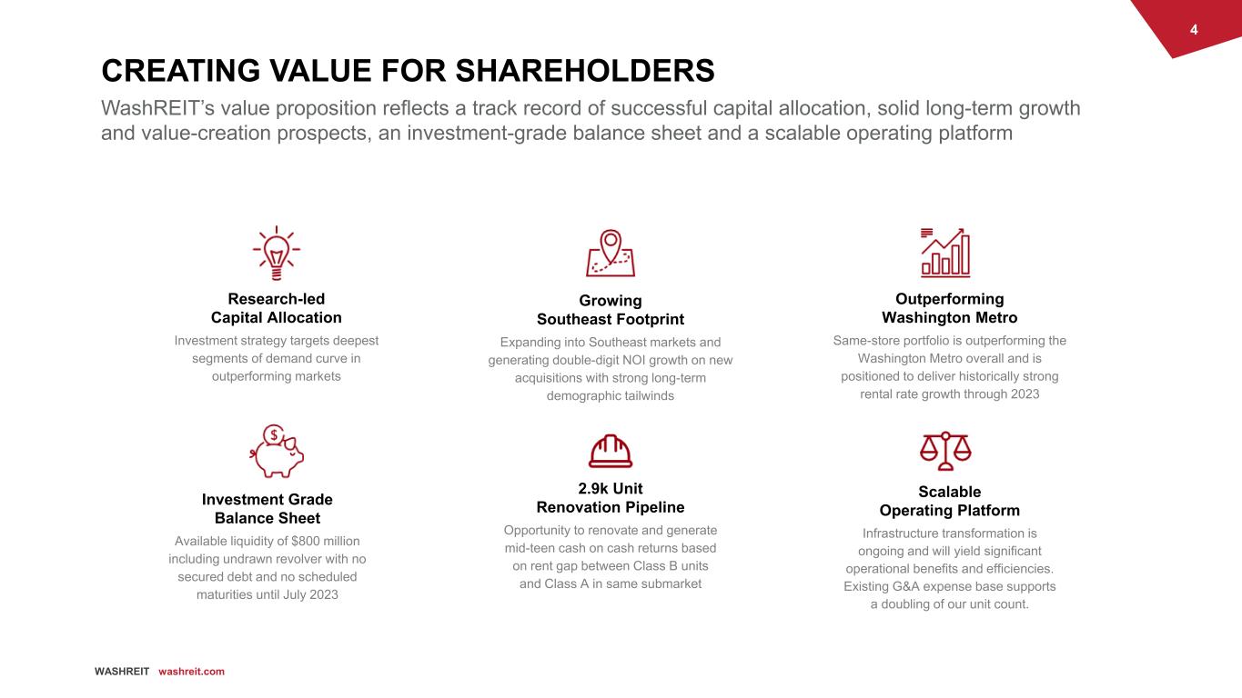 3 WASHREIT washreit.com WHY INVEST IN WASHREIT WashREIT’s earnings momentum is building as Southeast acquisitions and historically high rent growth establish a higher baseline NOI level to grow from With a transformed operating platform and scalable G&A expense base, we expect to deliver improved operating leverage as our portfolio grows WashREIT currently offers a compelling value proposition, with the opportunity to participate in value creation as we earn a lower implied cap rate
