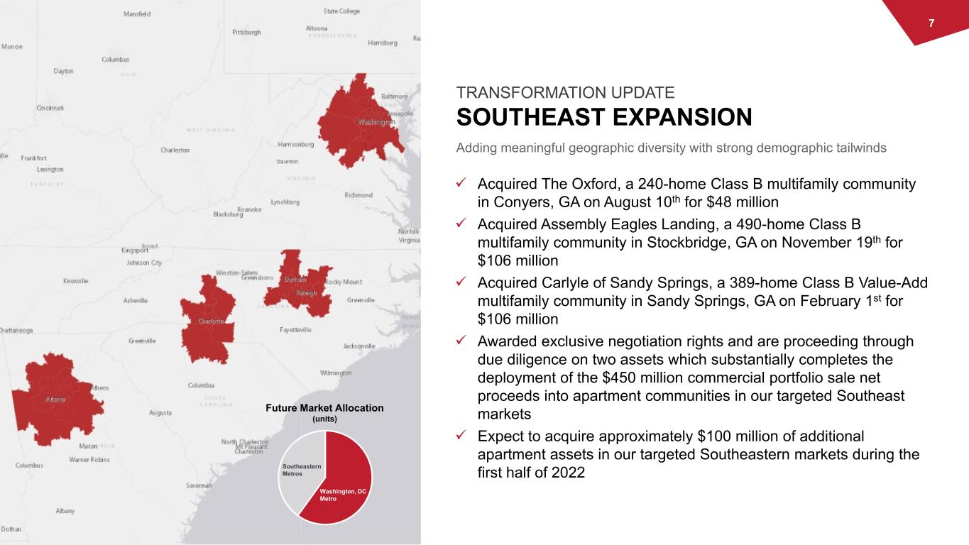 6 WASHREIT washreit.com VA MDMD Retail Northern Virginia We have closed or been awarded exclusive negotiation rights for essentially all of our initial $450 million acquisition target and nearly two-thirds of our 2022 acquisition guidance. We are in discussions in pursuit of additional opportunities and by mid-year, we expect to complete approximately $100 million of additional multifamily acquisitions in the Southeast. Beyond that, we expect to continue to grow our Southeast footprint. CURRENT PORTFOLIO MIX as of March 20221 Note: Refer to slide 2 for certain disclosures regarding Forward-Looking Statements and Strategic Transactions. Note: Portfolio composition based on portfolio square feet by asset class and geography. 1 Pro forma for awarded assets of $178 million, which assumes approximately 740,000 square feet are purchased 2 Pro forma portfolio square feet for reinvestment of $450 million of proceeds into multifamily acquisitions. Also assumes reinvestment of $68 million of ATM proceeds. Assumes 2.7 million square feet are purchased in multifamily acquisitions and distributed between North Carolina, South Carolina and Georgia. DC 10% MD 7% VA 53% Southeast 30% YEAR-END TARGET Transaction Capital and Equity Fully Deployed2 DC 11% MD 8% VA 57% Southeast 24% TRANSFORMATION UPDATE CAPITAL DEPLOYMENT Recently awarded assets in the Southeast