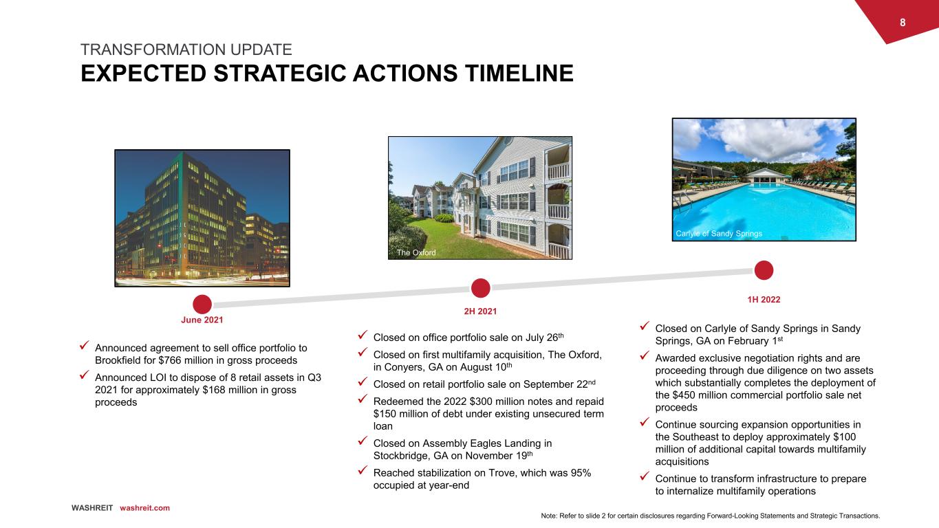 7 WASHREIT washreit.com VA Northern Virginia MD Adding meaningful geographic diversity with strong demographic tailwinds Acquired The Oxford, a 240-home Class B multifamily community in Conyers, GA on August 10th for $48 million Acquired Assembly Eagles Landing, a 490-home Class B multifamily community in Stockbridge, GA on November 19th for $106 million Acquired Carlyle of Sandy Springs, a 389-home Class B Value-Add multifamily community in Sandy Springs, GA on February 1st for $106 million Awarded exclusive negotiation rights and are proceeding through due diligence on two assets which substantially completes the deployment of the $450 million commercial portfolio sale net proceeds into apartment communities in our targeted Southeast markets Expect to acquire approximately $100 million of additional apartment assets in our targeted Southeastern markets during the first half of 2022 TRANSFORMATION UPDATE SOUTHEAST EXPANSION Washington, DC Metro Southeastern Metros Future Market Allocation (units)