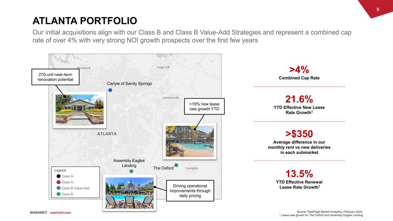 8 WASHREIT washreit.com June 2021 Announced agreement to sell office portfolio to Brookfield for $766 million in gross proceeds Announced LOI to dispose of 8 retail assets in Q3 2021 for approximately $168 million in gross proceeds Closed on office portfolio sale on July 26th Closed on first multifamily acquisition, The Oxford, in Conyers, GA on August 10th Closed on retail portfolio sale on September 22nd Redeemed the 2022 $300 million notes and repaid $150 million of debt under existing unsecured term loan Closed on Assembly Eagles Landing in Stockbridge, GA on November 19th Reached stabilization on Trove, which was 95% occupied at year-end 2H 2021 Closed on Carlyle of Sandy Springs in Sandy Springs, GA on February 1st Awarded exclusive negotiation rights and are proceeding through due diligence on two assets which substantially completes the deployment of the $450 million commercial portfolio sale net proceeds Continue sourcing expansion opportunities in the Southeast to deploy approximately $100 million of additional capital towards multifamily acquisitions Continue to transform infrastructure to prepare to internalize multifamily operations 1H 2022 Note: Refer to slide 2 for certain disclosures regarding Forward-Looking Statements and Strategic Transactions. TRANSFORMATION UPDATE EXPECTED STRATEGIC ACTIONS TIMELINE The Oxford Carlyle of Sandy Springs