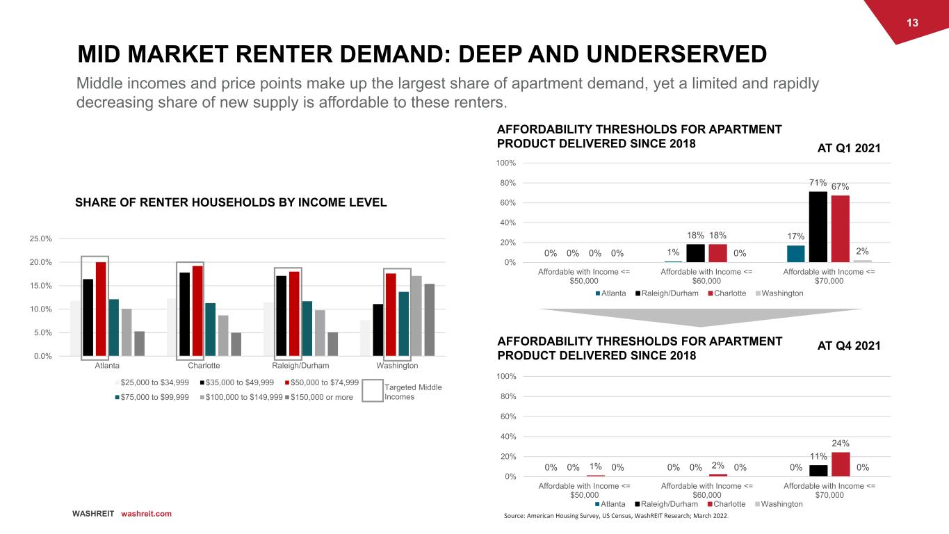 13 WASHREIT washreit.com MID MARKET RENTER DEMAND: DEEP AND UNDERSERVED Source: American Housing Survey, US Census, WashREIT Research; March 2022. 0.0% 5.0% 10.0% 15.0% 20.0% 25.0% Atlanta Charlotte Raleigh/Durham Washington $25,000 to $34,999 $35,000 to $49,999 $50,000 to $74,999 $75,000 to $99,999 $100,000 to $149,999 $150,000 or more Targeted Middle Incomes SHARE OF RENTER HOUSEHOLDS BY INCOME LEVEL 0% 1% 17% 0% 18% 71% 0% 18% 67% 0% 0% 2% 0% 20% 40% 60% 80% 100% Affordable with Income <= $50,000 Affordable with Income <= $60,000 Affordable with Income <= $70,000 Atlanta Raleigh/Durham Charlotte Washington AFFORDABILITY THRESHOLDS FOR APARTMENT PRODUCT DELIVERED SINCE 2018 Middle incomes and price points make up the largest share of apartment demand, yet a limited and rapidly decreasing share of new supply is affordable to these renters. 0% 0% 0%0% 0% 11% 1% 2% 24% 0% 0% 0% 0% 20% 40% 60% 80% 100% Affordable with Income <= $50,000 Affordable with Income <= $60,000 Affordable with Income <= $70,000 Atlanta Raleigh/Durham Charlotte Washington AFFORDABILITY THRESHOLDS FOR APARTMENT PRODUCT DELIVERED SINCE 2018 AT Q1 2021 AT Q4 2021