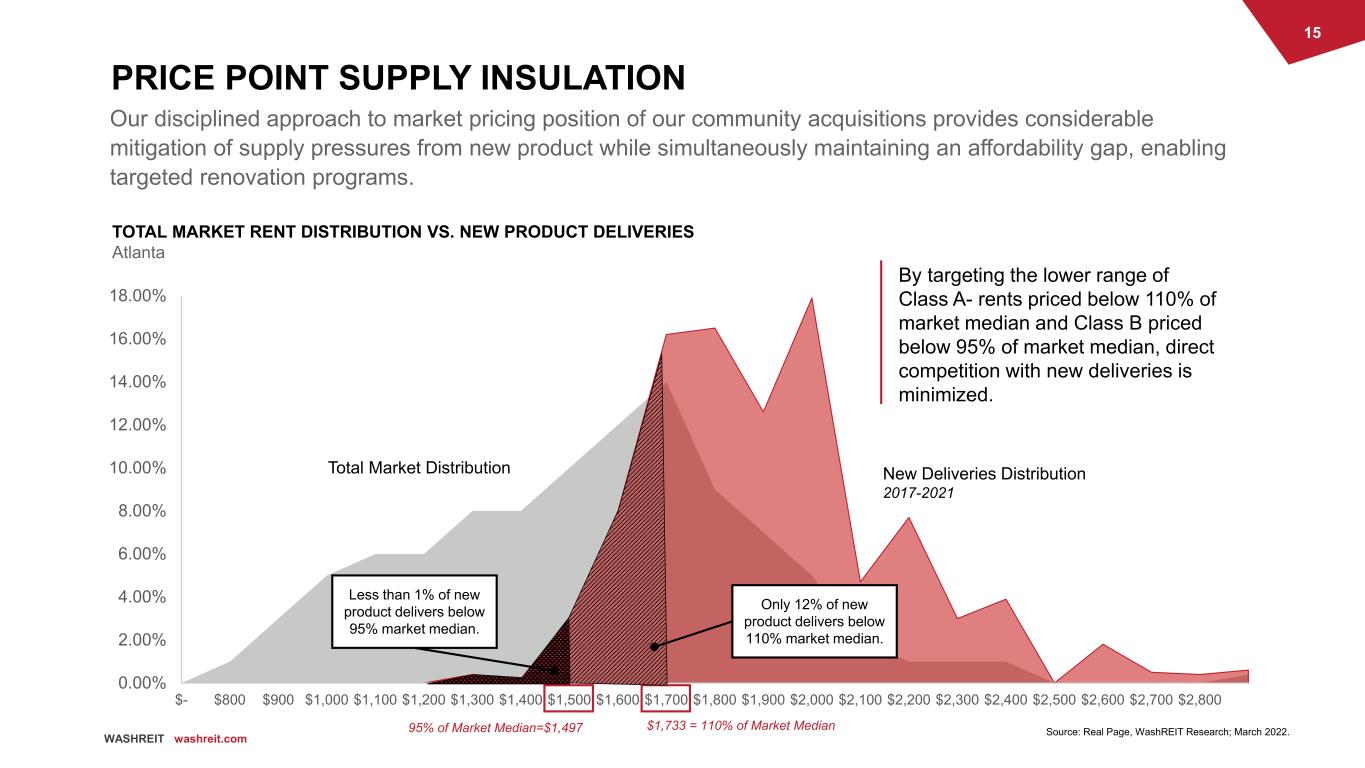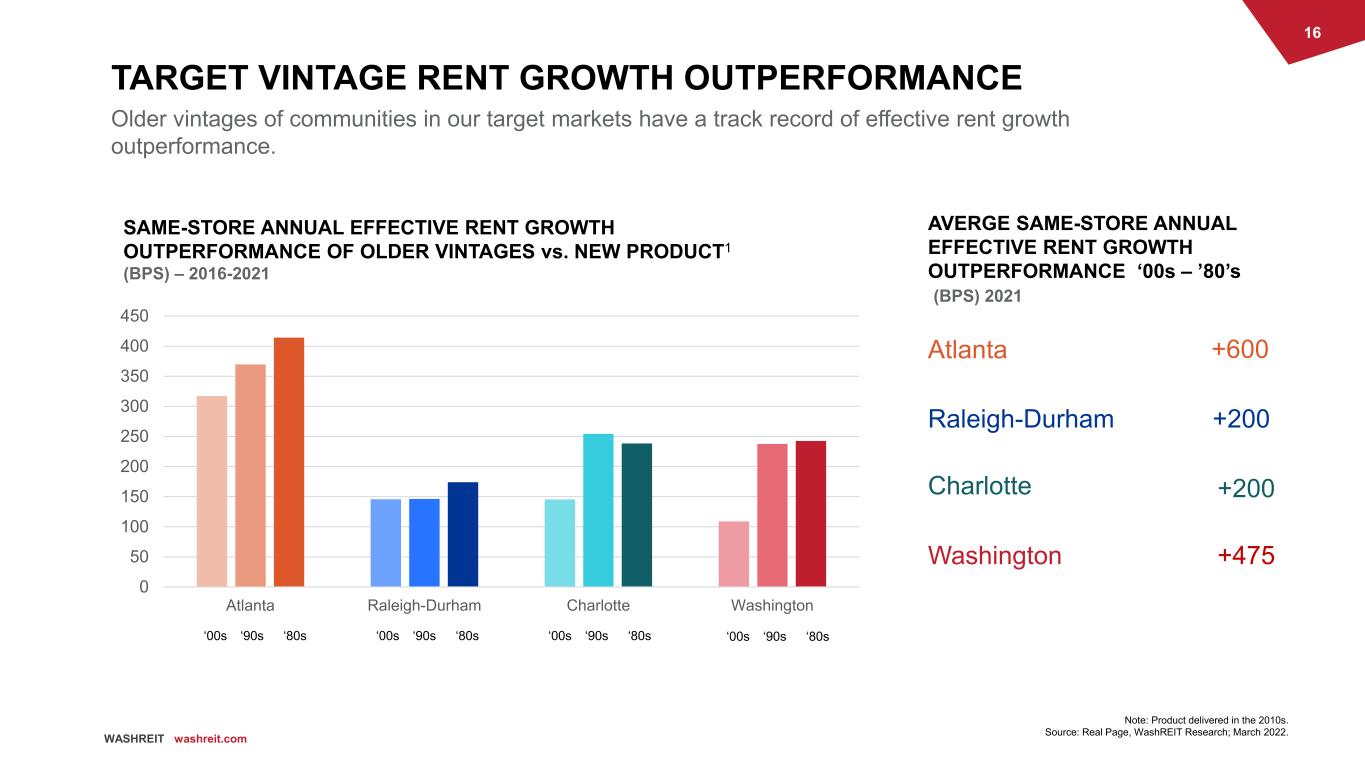 15 WASHREIT washreit.com PRICE POINT SUPPLY INSULATION Our disciplined approach to market pricing position of our community acquisitions provides considerable mitigation of supply pressures from new product while simultaneously maintaining an affordability gap, enabling targeted renovation programs. 0.00% 2.00% 4.00% 6.00% 8.00% 10.00% 12.00% 14.00% 16.00% 18.00% $- $800 $900 $1,000 $1,100 $1,200 $1,300 $1,400 $1,500 $1,600 $1,700 $1,800 $1,900 $2,000 $2,100 $2,200 $2,300 $2,400 $2,500 $2,600 $2,700 $2,800 Total Market Distribution New Deliveries Distribution 2017-2021 $1,733 = 110% of Market Median By targeting the lower range of Class A- rents priced below 110% of market median and Class B priced below 95% of market median, direct competition with new deliveries is minimized. Source: Real Page, WashREIT Research; March 2022.95% of Market Median=$1,497 TOTAL MARKET RENT DISTRIBUTION VS. NEW PRODUCT DELIVERIES Atlanta Only 12% of new product delivers below 110% market median. Less than 1% of new product delivers below 95% market median.