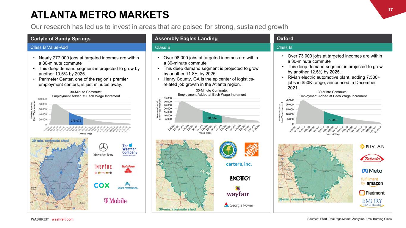 17 WASHREIT washreit.com Oxford • Over 73,000 jobs at targeted incomes are within a 30-minute commute • This deep demand segment is projected to grow by another 12.5% by 2025. • Rivian electric automotive plant, adding 7,500+ jobs in $50K range, announced in December 2021. 30-min. commute shed Sources: ESRI, RealPage Market Analytics, Emsi Burning Glass. W or ke rs A dd ed a t Ea ch W ag e In cr em en t 30-Minte Commute: Employment Added at Each Wage Increment Annual Wage • Over 98,000 jobs at targeted incomes are within a 30-minute commute • This deep demand segment is projected to grow by another 11.8% by 2025. • Henry County, GA is the epicenter of logistics- related job growth in the Atlanta region. W or ke rs A dd ed a t Ea ch W ag e In cr em en t 30-Minute Commute: Employment Added at Each Wage Increment Assembly Eagles Landing • Nearly 277,000 jobs at targeted incomes are within a 30-minute commute • This deep demand segment is projected to grow by another 10.5% by 2025. • Perimeter Center, one of the region’s premier employment centers, is just minutes away. 30-min. commute shed W or ke rs A dd ed a t Ea ch W ag e In cr em en t 30-Minute Commute: Employment Added at Each Wage Increment Carlyle of Sandy Springs ATLANTA METRO MARKETS Our research has led us to invest in areas that are poised for strong, sustained growth 30-min. commute shed Annual WageAnnual Wage 0 5,000 10,000 15,000 20,000 25,000 73,349 - 5,000 10,000 15,000 20,000 25,000 30,000 35,000 98,064 0 20,000 40,000 60,000 80,000 100,000 276,976 Class B Value-Add Class B Class B
