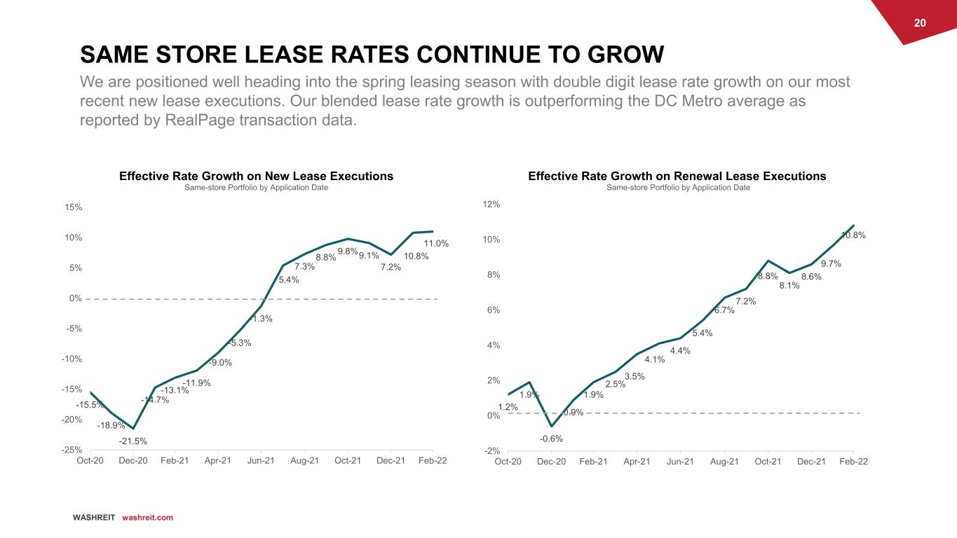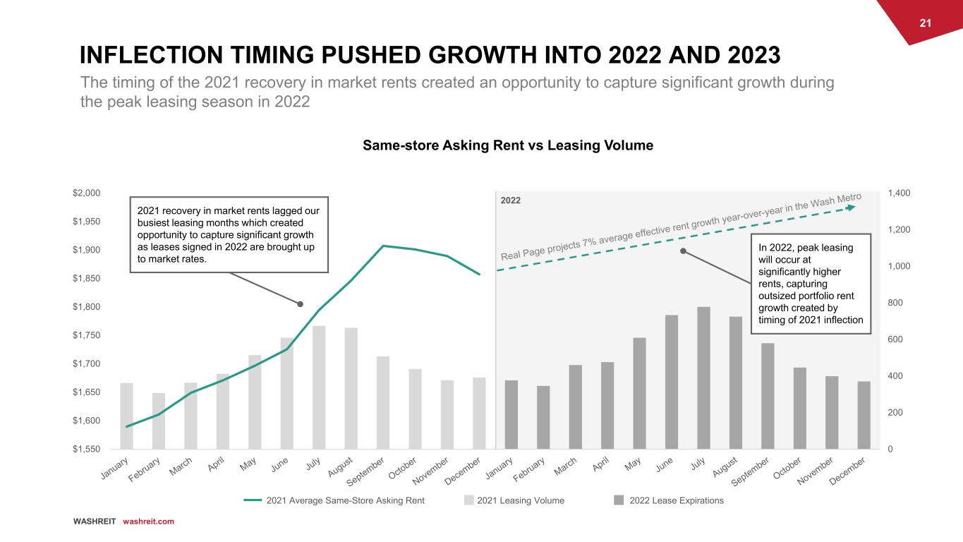 20 WASHREIT washreit.com SAME STORE LEASE RATES CONTINUE TO GROW We are positioned well heading into the spring leasing season with double digit lease rate growth on our most recent new lease executions. Our blended lease rate growth is outperforming the DC Metro average as reported by RealPage transaction data. -15.5% -18.9% -21.5% -14.7% -13.1% -11.9% -9.0% -5.3% -1.3% 5.4% 7.3% 8.8% 9.8%9.1% 7.2% 10.8% 11.0% -25% -20% -15% -10% -5% 0% 5% 10% 15% Oct-20 Dec-20 Feb-21 Apr-21 Jun-21 Aug-21 Oct-21 Dec-21 Feb-22 Effective Rate Growth on New Lease Executions Same-store Portfolio by Application Date 1.2% 1.9% -0.6% 0.9% 1.9% 2.5% 3.5% 4.1% 4.4% 5.4% 6.7% 7.2% 8.8% 8.1% 8.6% 9.7% 10.8% -2% 0% 2% 4% 6% 8% 10% 12% Oct-20 Dec-20 Feb-21 Apr-21 Jun-21 Aug-21 Oct-21 Dec-21 Feb-22 Effective Rate Growth on Renewal Lease Executions Same-store Portfolio by Application Date