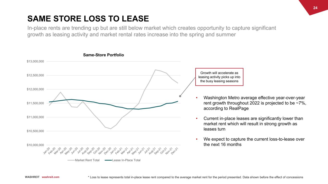 23 WASHREIT washreit.com RETENTION AND OCCUPANCY 51% 51% 57% 60% 72% 0% 10% 20% 30% 40% 50% 60% 70% 80% Q4 2020 Q1 2021 Q2 2021 Q3 2021 Q4 2021 Same-Store Retention Retention was a very strong 72% during the fourth quarter, higher than expected, and a significant increase compared to 51% in Q4 2020. This has allowed us to retain high occupancy during the slower winter leasing period and to begin to capture stronger renewal rates. 93.0% 93.5% 94.0% 94.5% 95.0% 95.5% 96.0% 96.5% 97.0% Same-Store Daily Occupancy