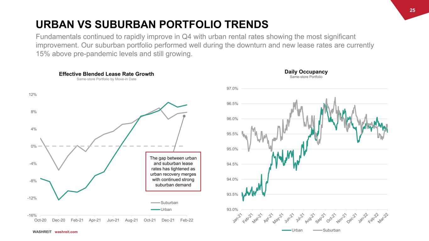 24 WASHREIT washreit.com $10,000,000 $10,500,000 $11,000,000 $11,500,000 $12,000,000 $12,500,000 $13,000,000 Same-Store Portfolio Market Rent Total Lease In-Place Total • Washington Metro average effective year-over-year rent growth throughout 2022 is projected to be ~7%, according to RealPage • Current in-place leases are significantly lower than market rent which will result in strong growth as leases turn • We expect to capture the current loss-to-lease over the next 16 months SAME STORE LOSS TO LEASE In-place rents are trending up but are still below market which creates opportunity to capture significant growth as leasing activity and market rental rates increase into the spring and summer * Loss to lease represents total in-place lease rent compared to the average market rent for the period presented. Data shown before the effect of concessions Growth will accelerate as leasing activity picks up into the busy leasing seasons